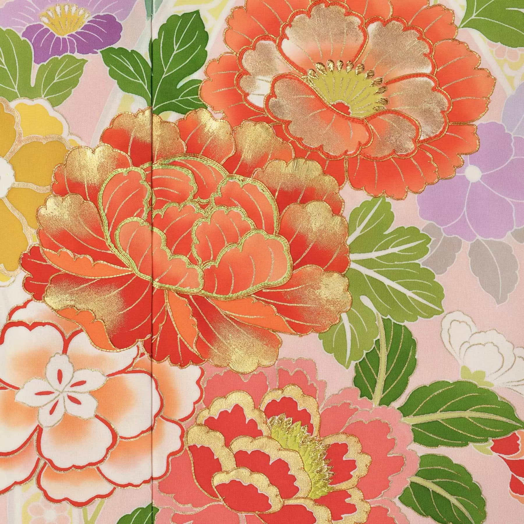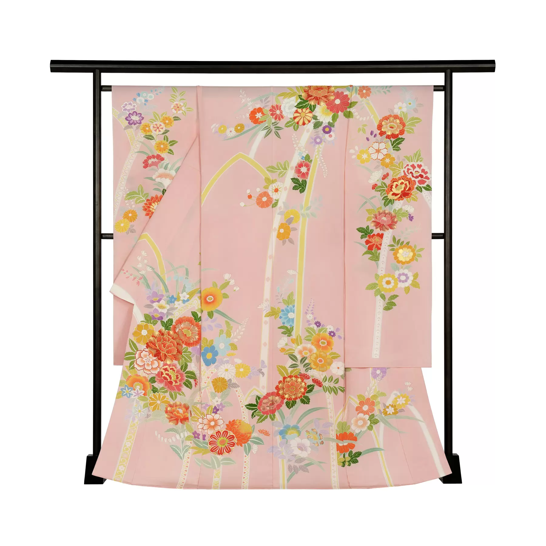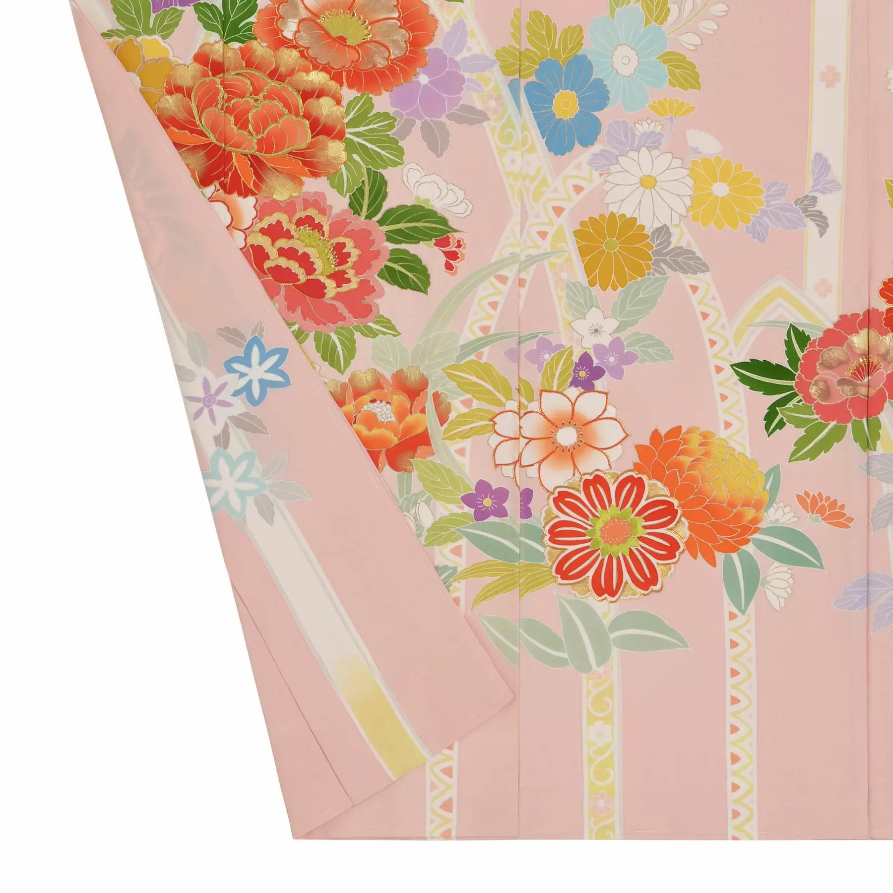 伝統的な古典柄をベースに、デザインや色彩は新鮮な感覚で、現代の女性を瑞々しく装う千總の振袖。晴れの日の心を華やかに彩ることを願って染めています。