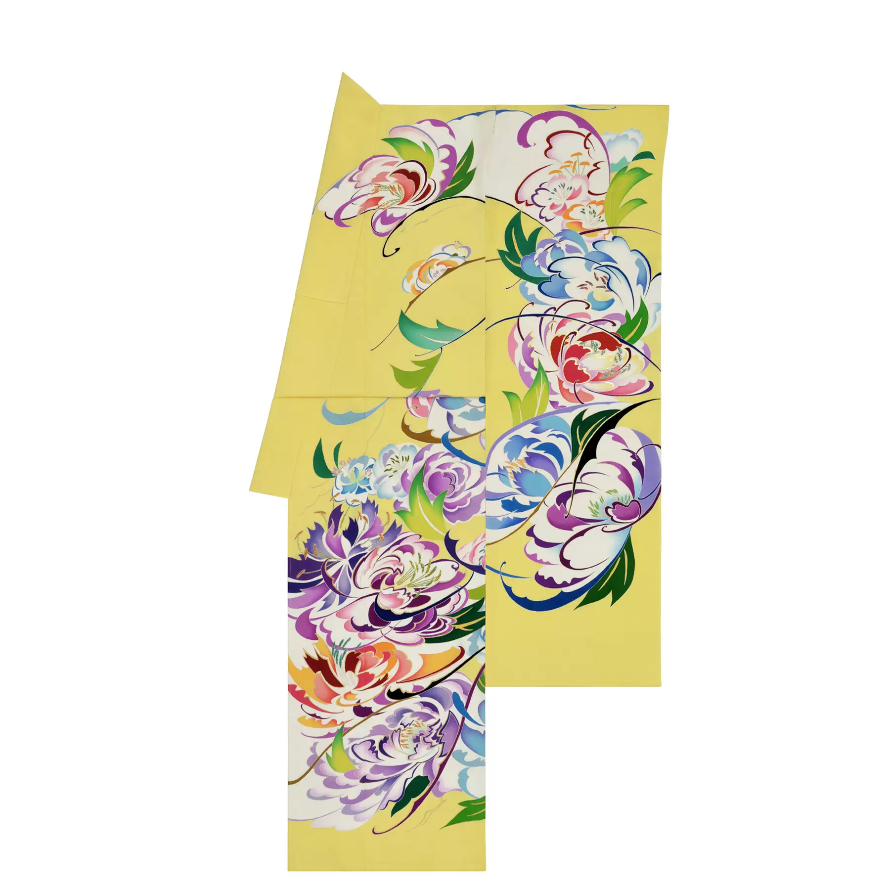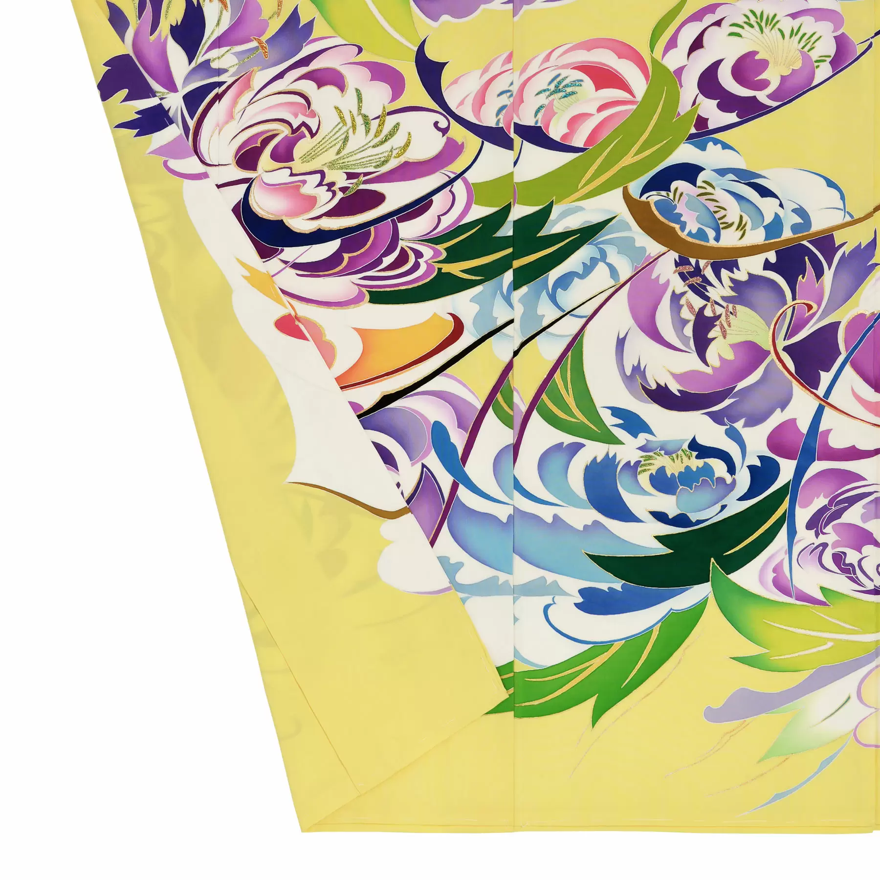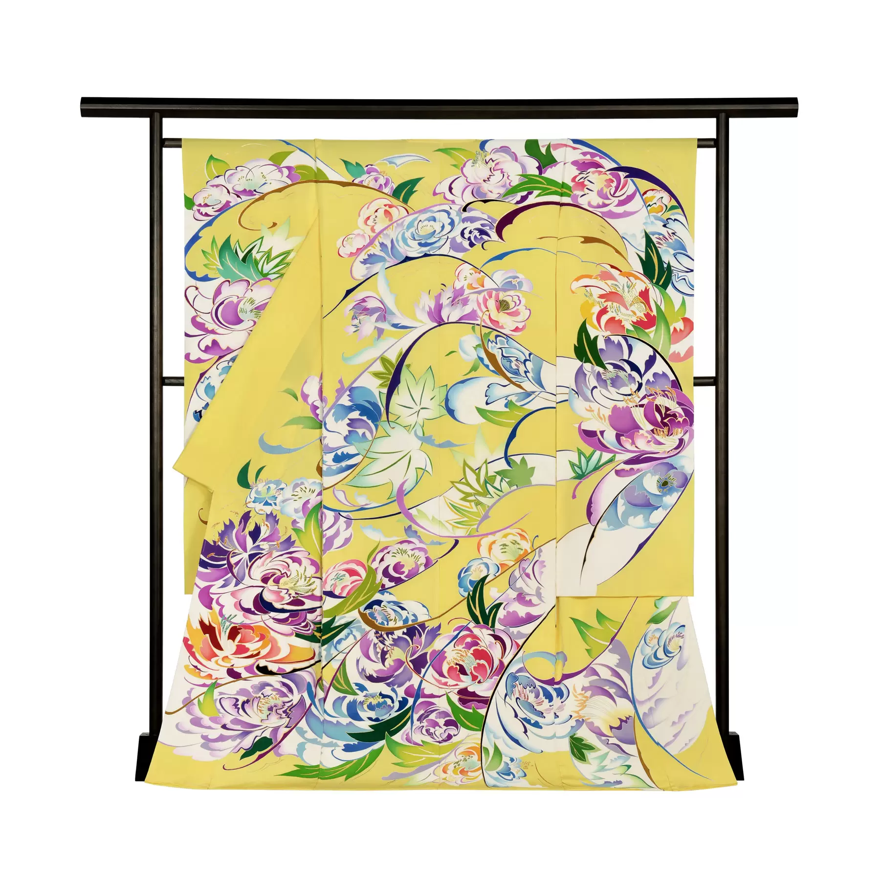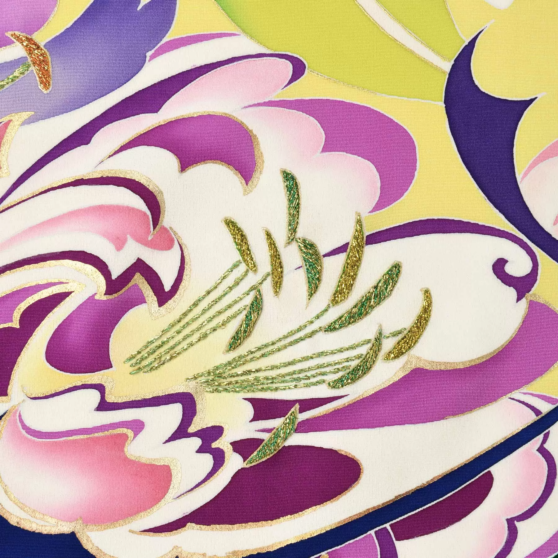 伝統的な古典柄をベースに、デザインや色彩は新鮮な感覚で、現代の女性を瑞々しく装う千總の振袖。晴れの日の心を華やかに彩ることを願って染めています。