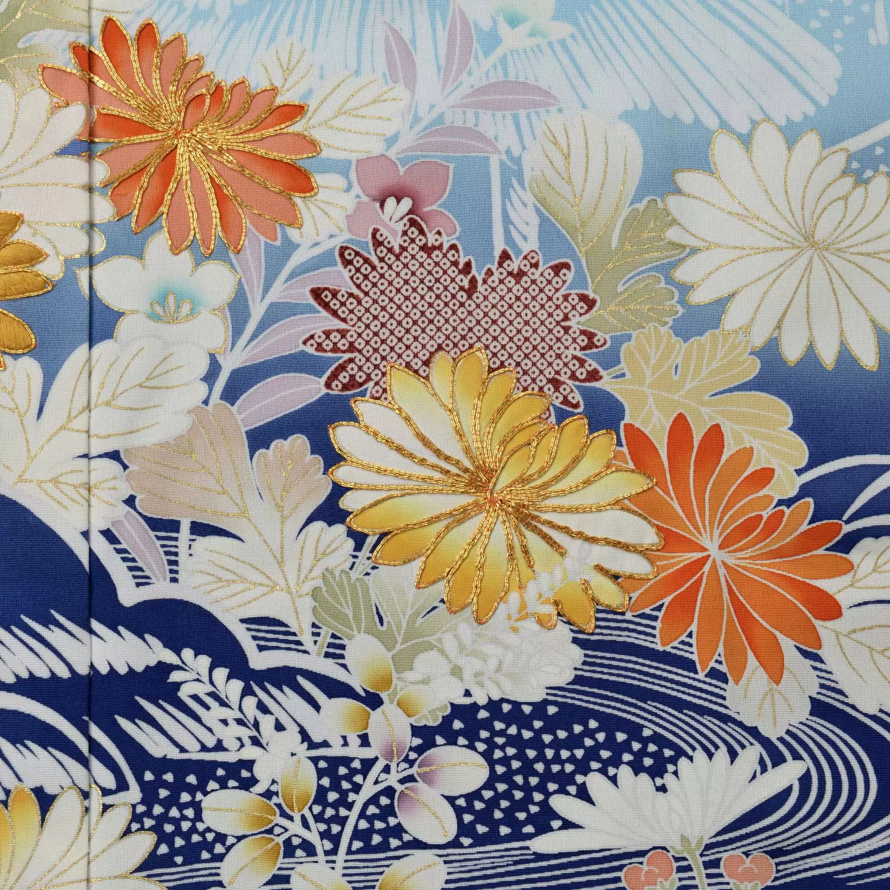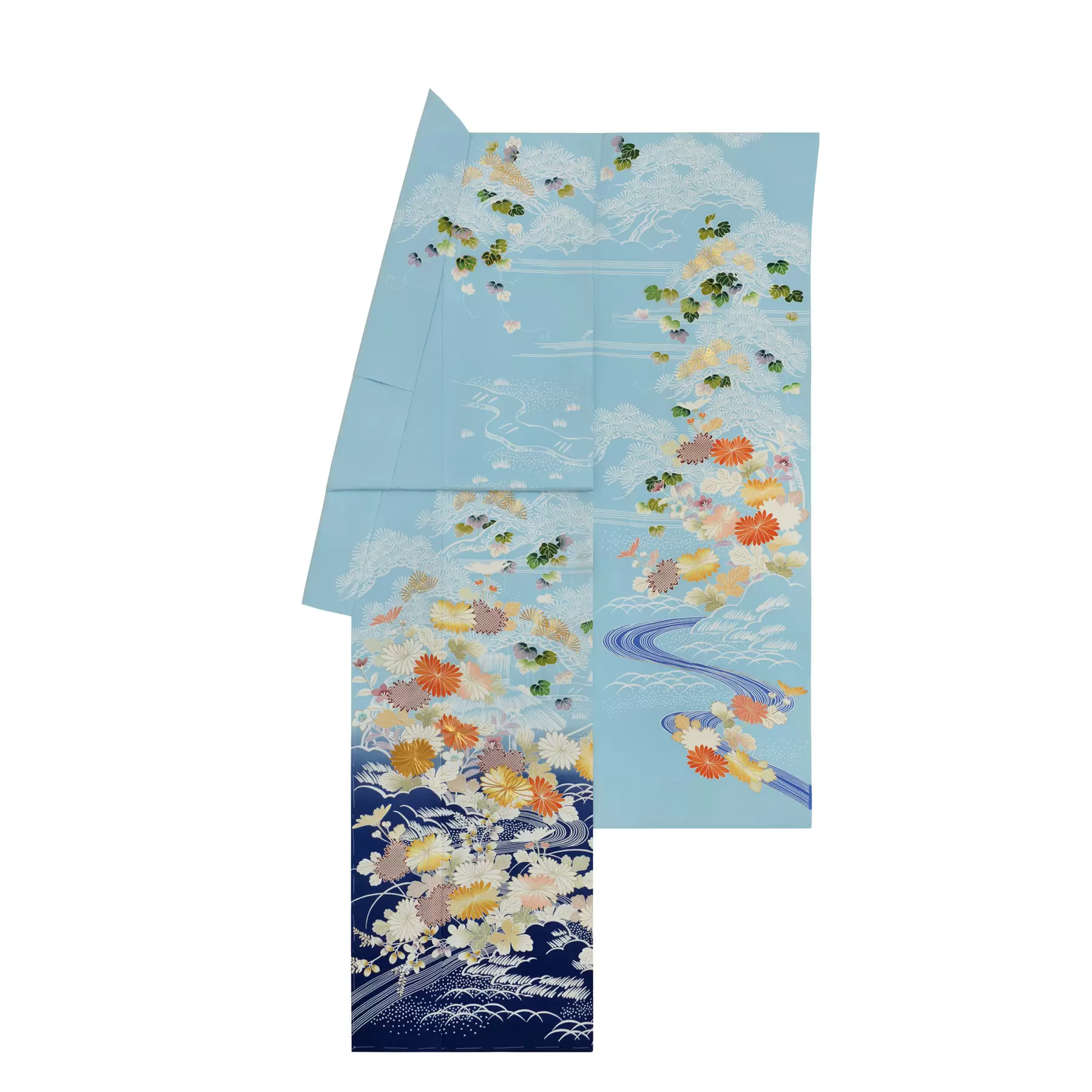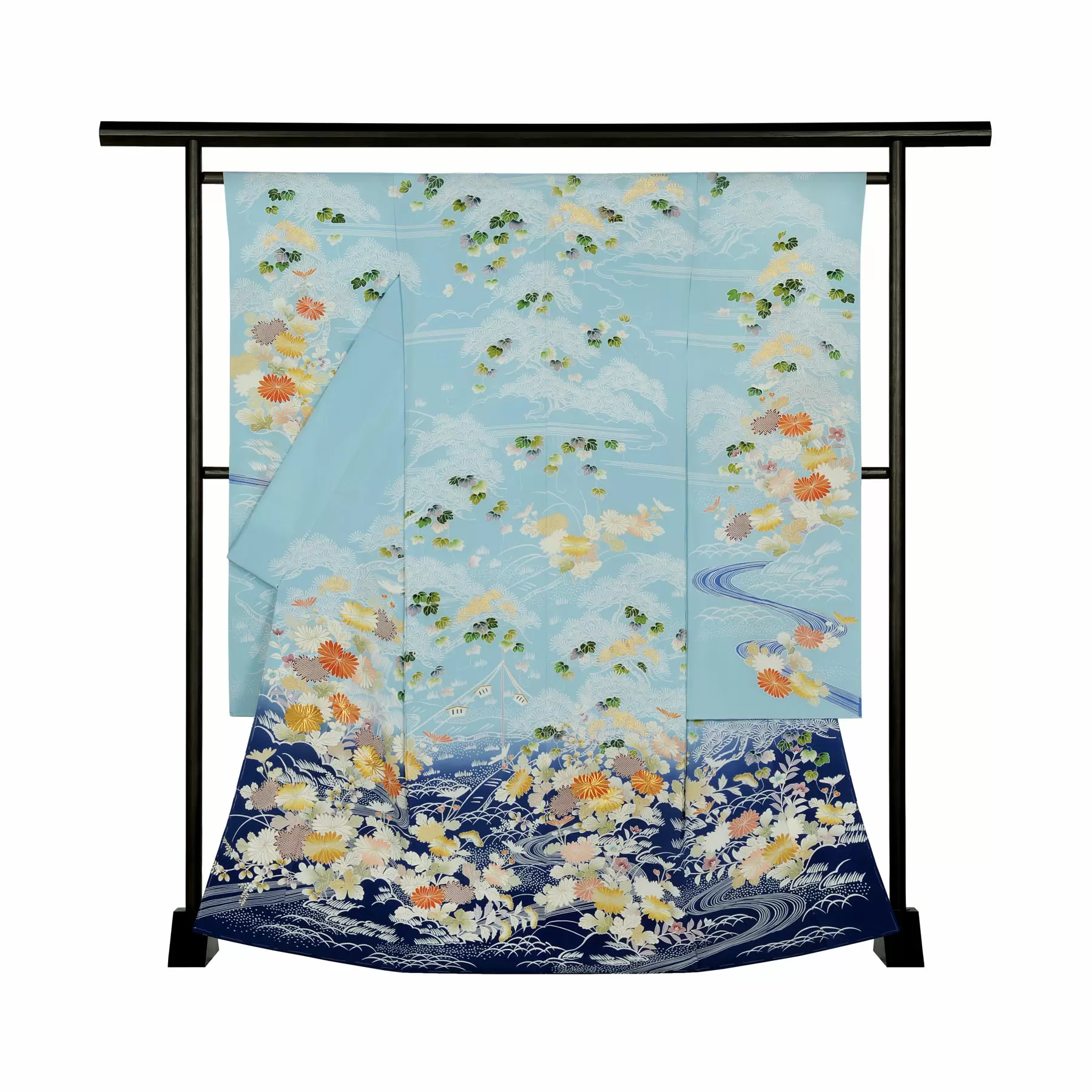 伝統的な古典柄をベースに、デザインや色彩は新鮮な感覚で、現代の女性を瑞々しく装う千總の振袖。晴れの日の心を華やかに彩ることを願って染めています。