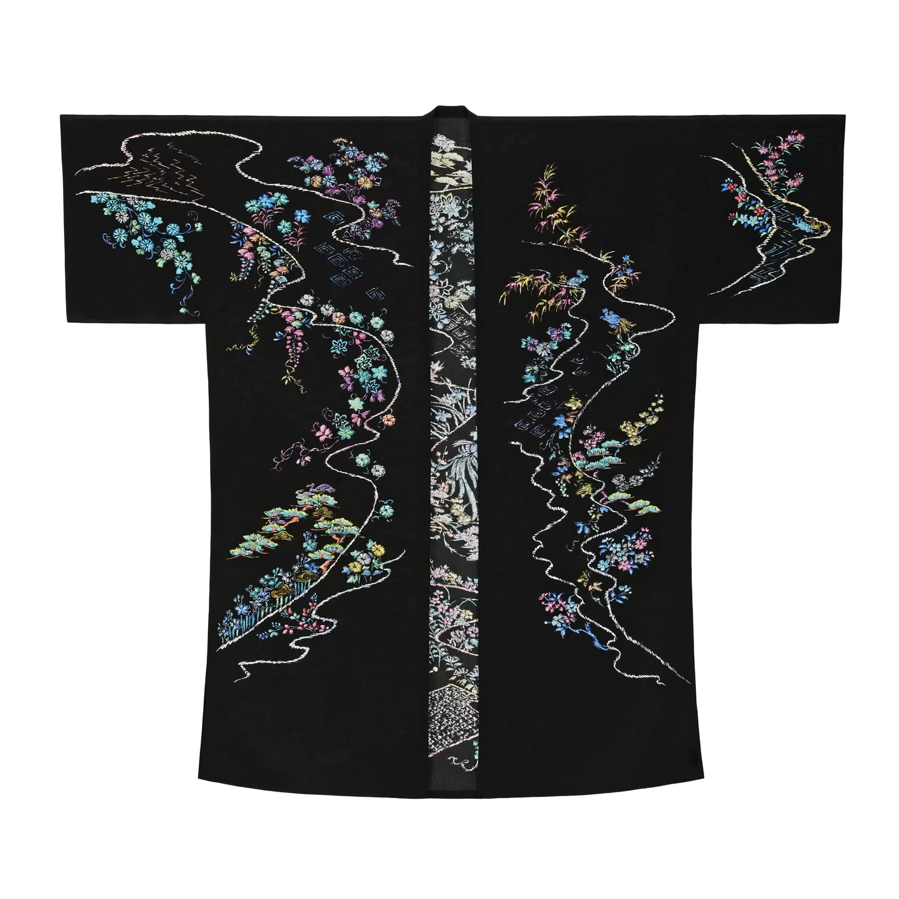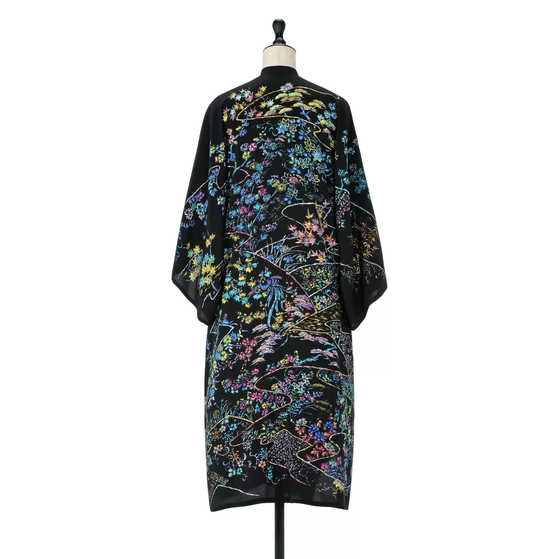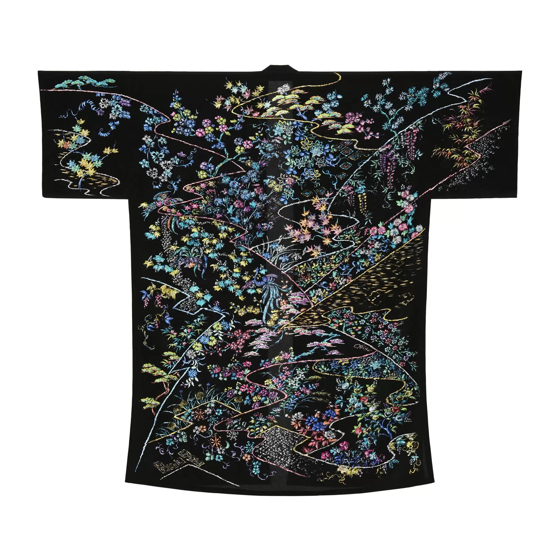 刺繍工程まで図案に描いてきた千總の着物づくりの歴史をヒントに、繊細なドローイングで本物の刺繍のように表現しました。