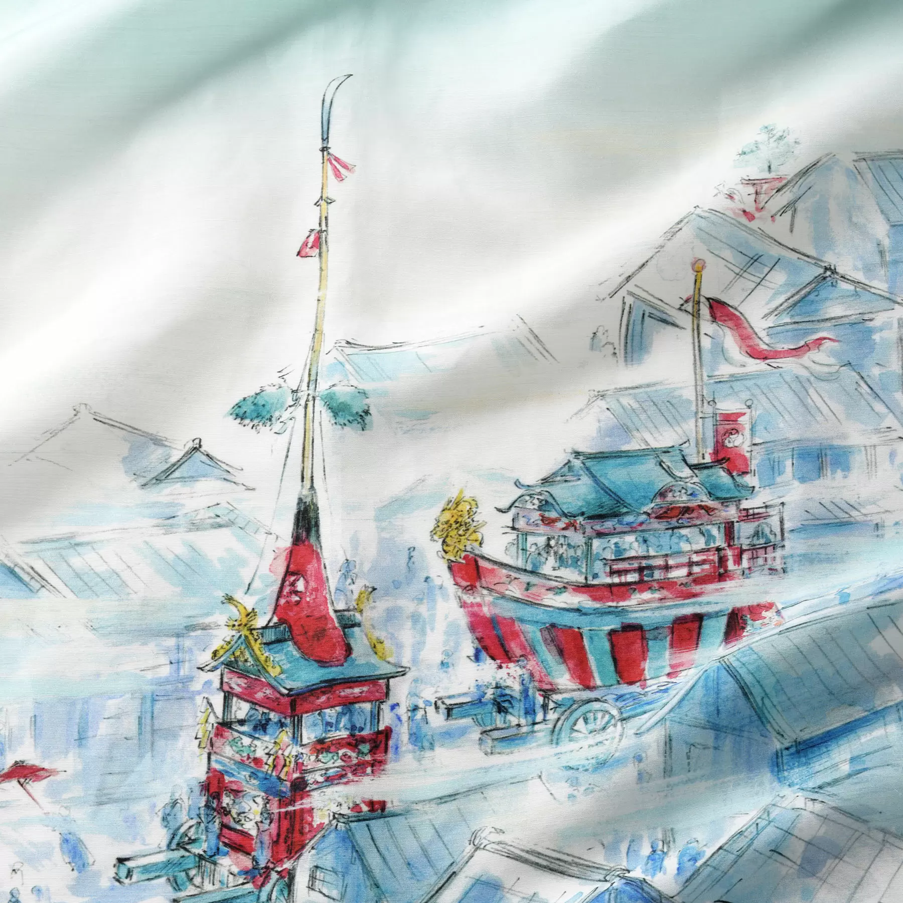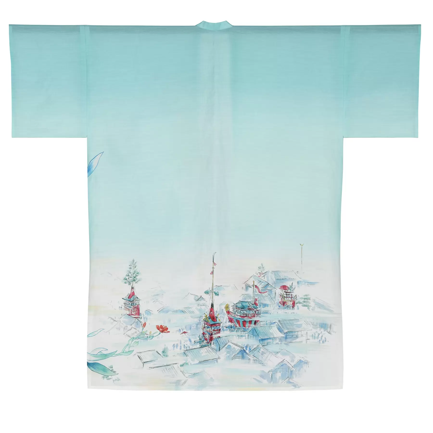 前面に檜扇をあしらい、背面の裾模様に山鉾や京都の街並みを描いています。