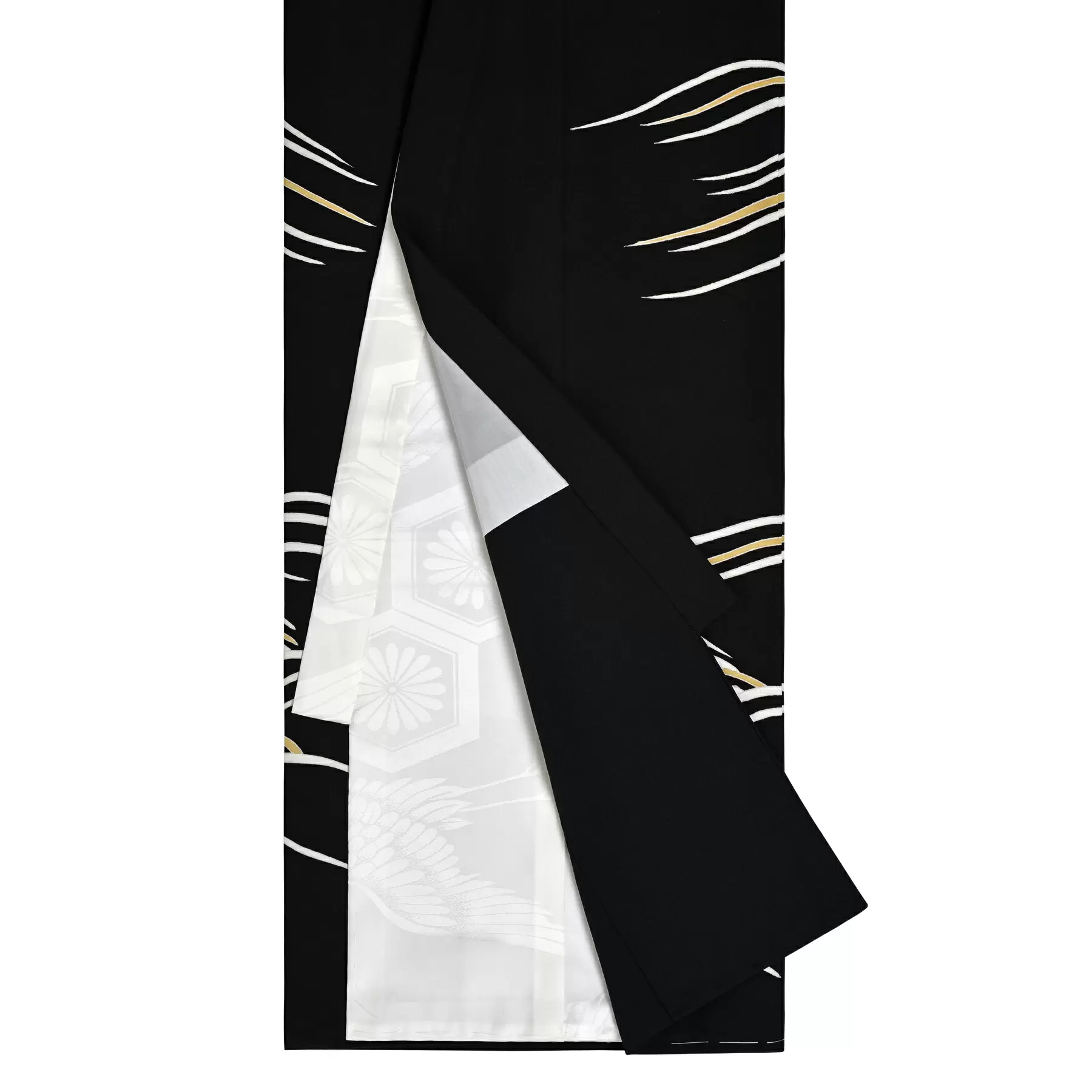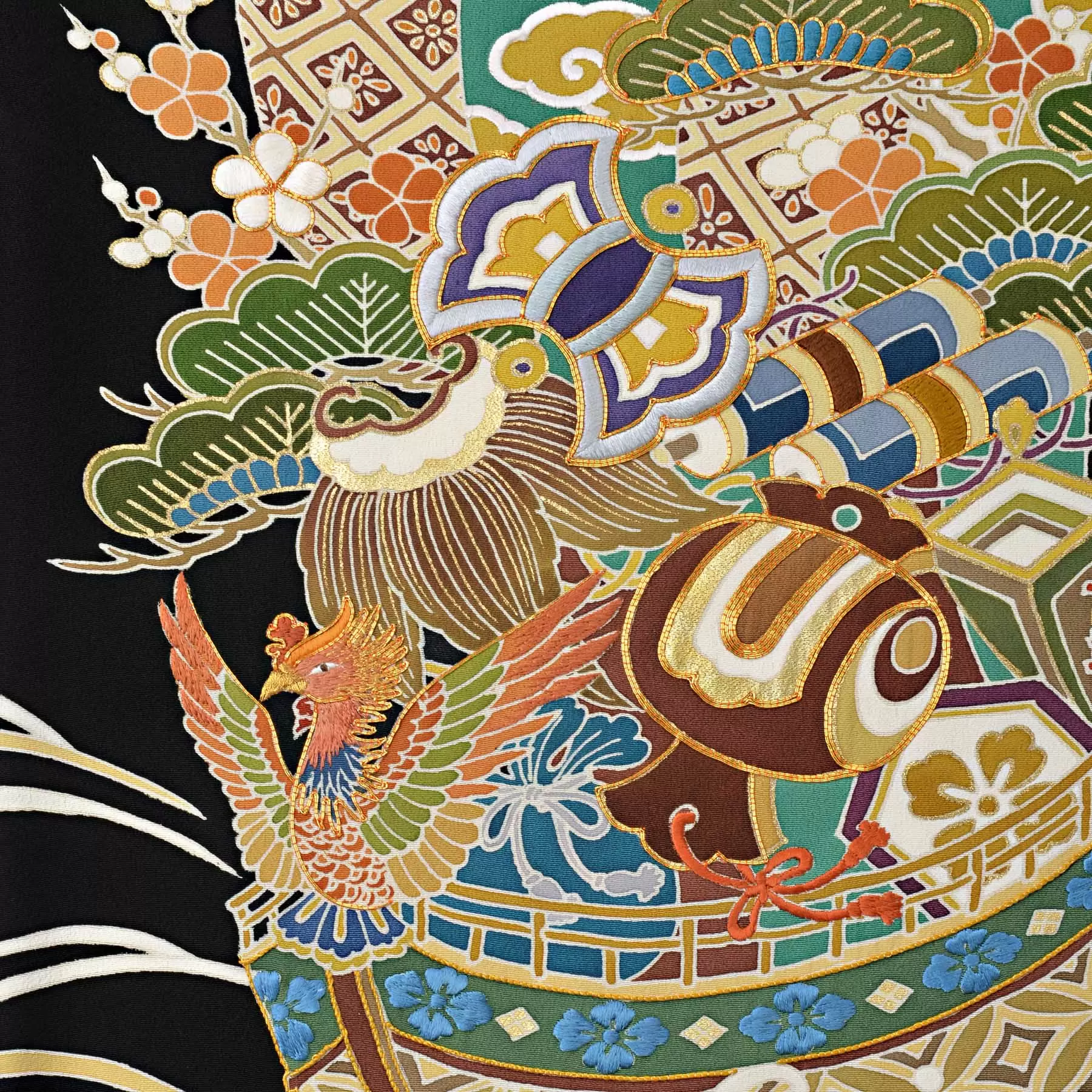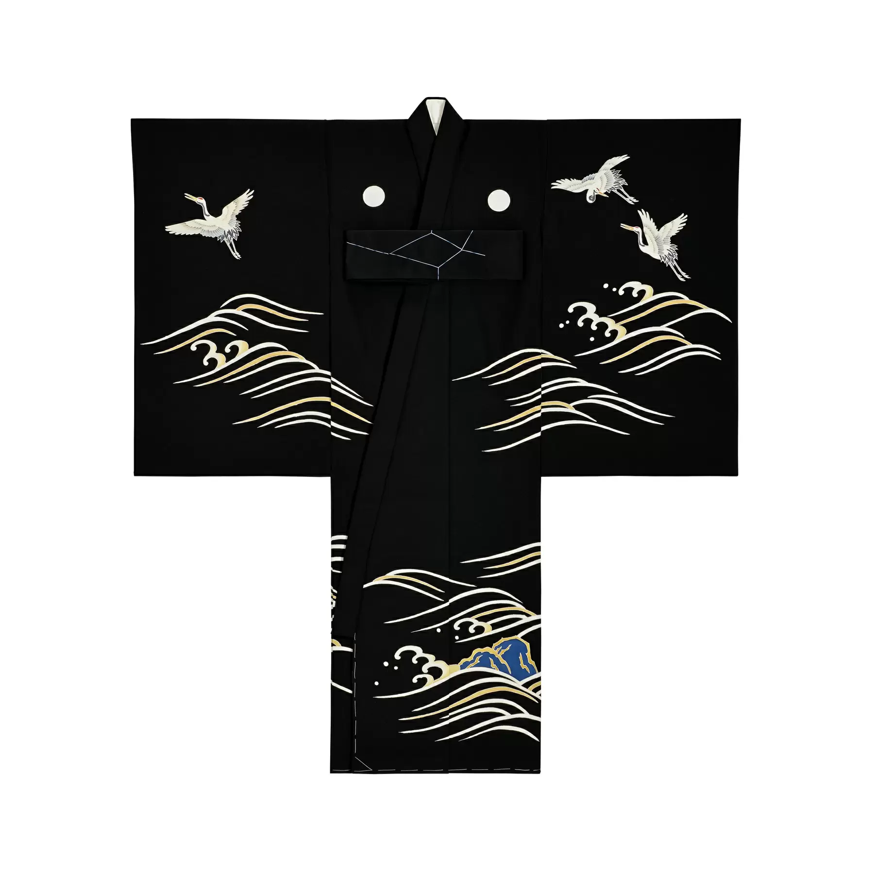 千總の初着は上着、下着ともに全て正絹で作られています。下着は白で、お袖にはブルーの地色の付袖が付いており、広袖にてお仕立てをしております。付け紐には紐飾りがされています。紋を入れてお届けいたします。