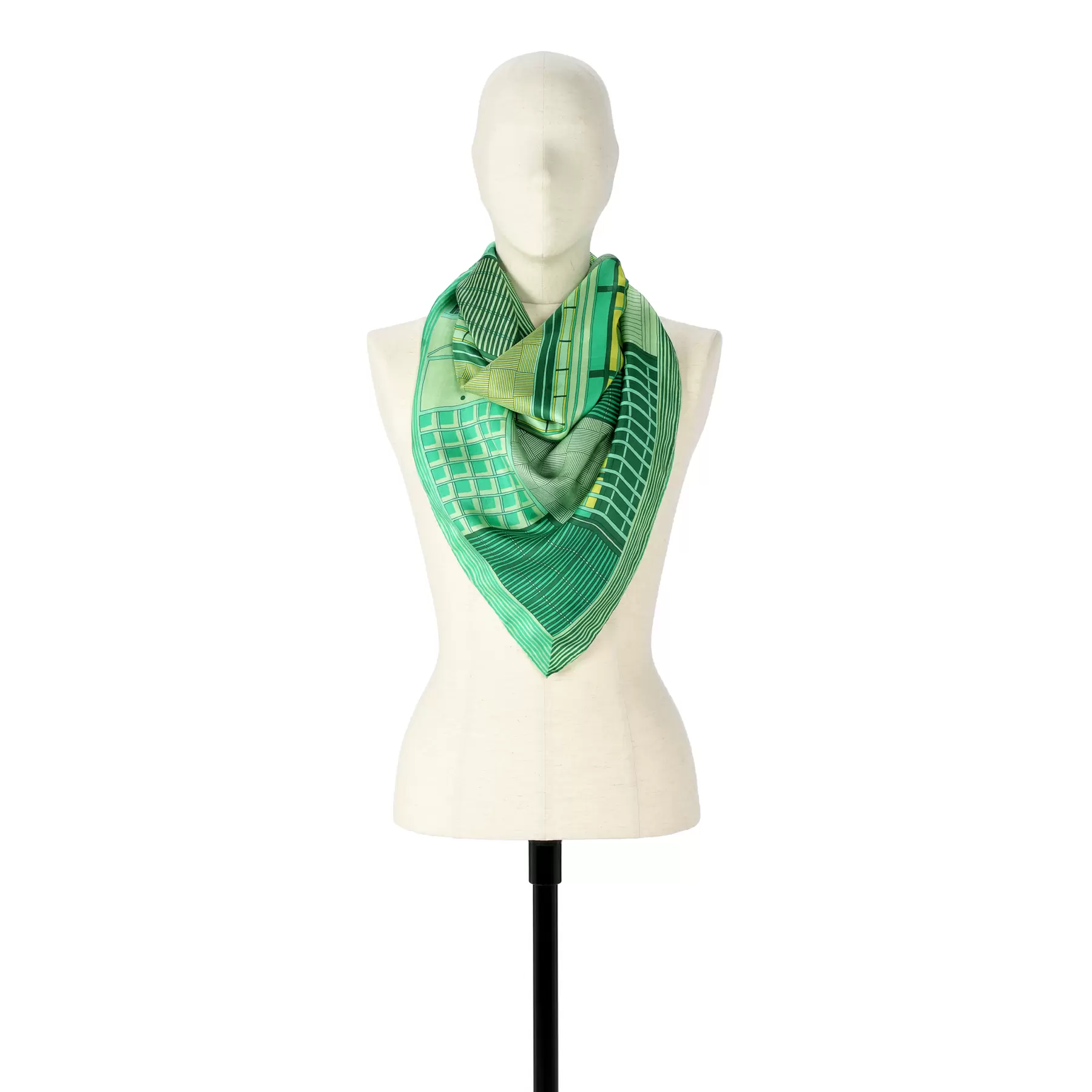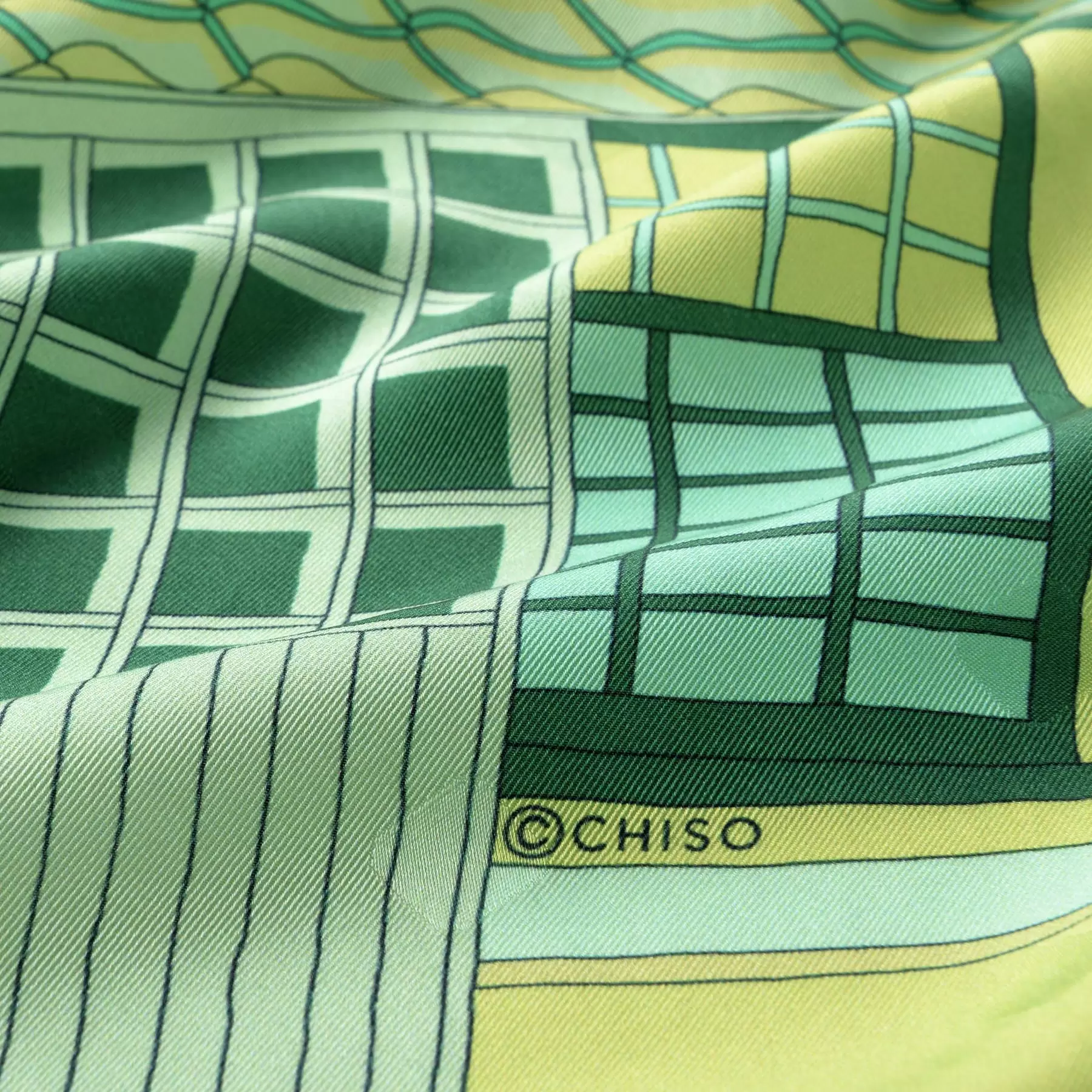 自然との調和を大事にしながら設計された京町家をデザインしたこちらのスカーフは、幾何学的な造りの中に覗く自然の柔らかな光や色彩を想像させてくれる一枚になっています。ワントーンに近いカラーリングはスタイリッシュで上品な印象を与えてくれます。