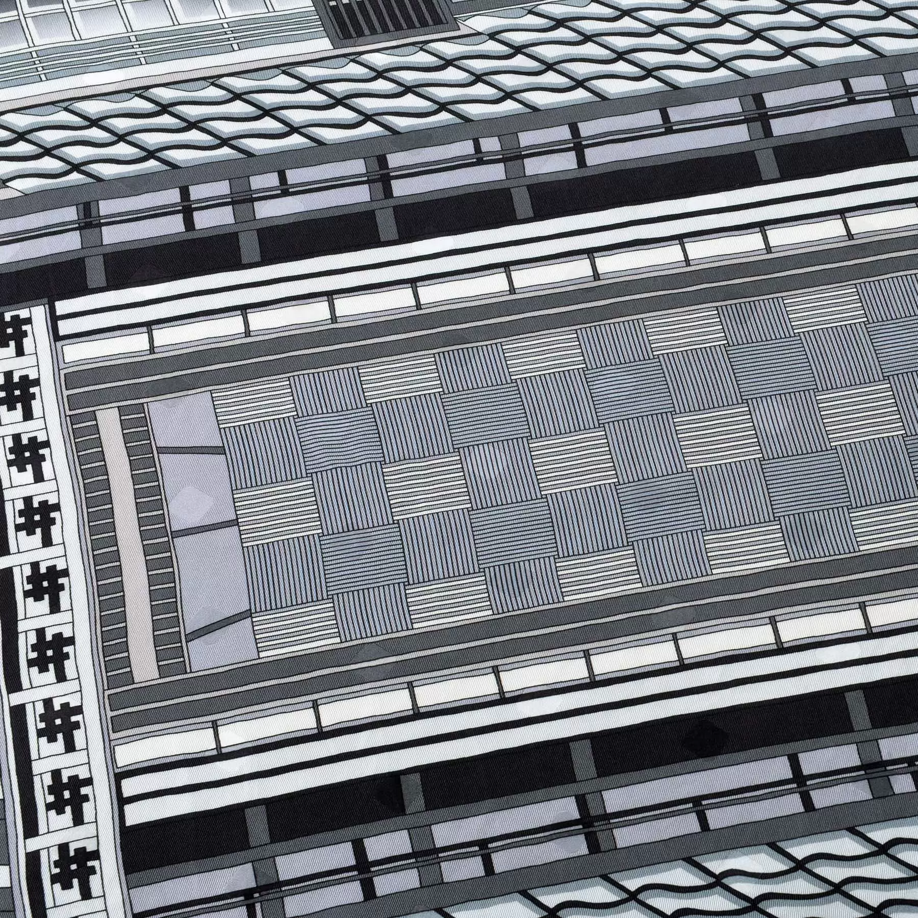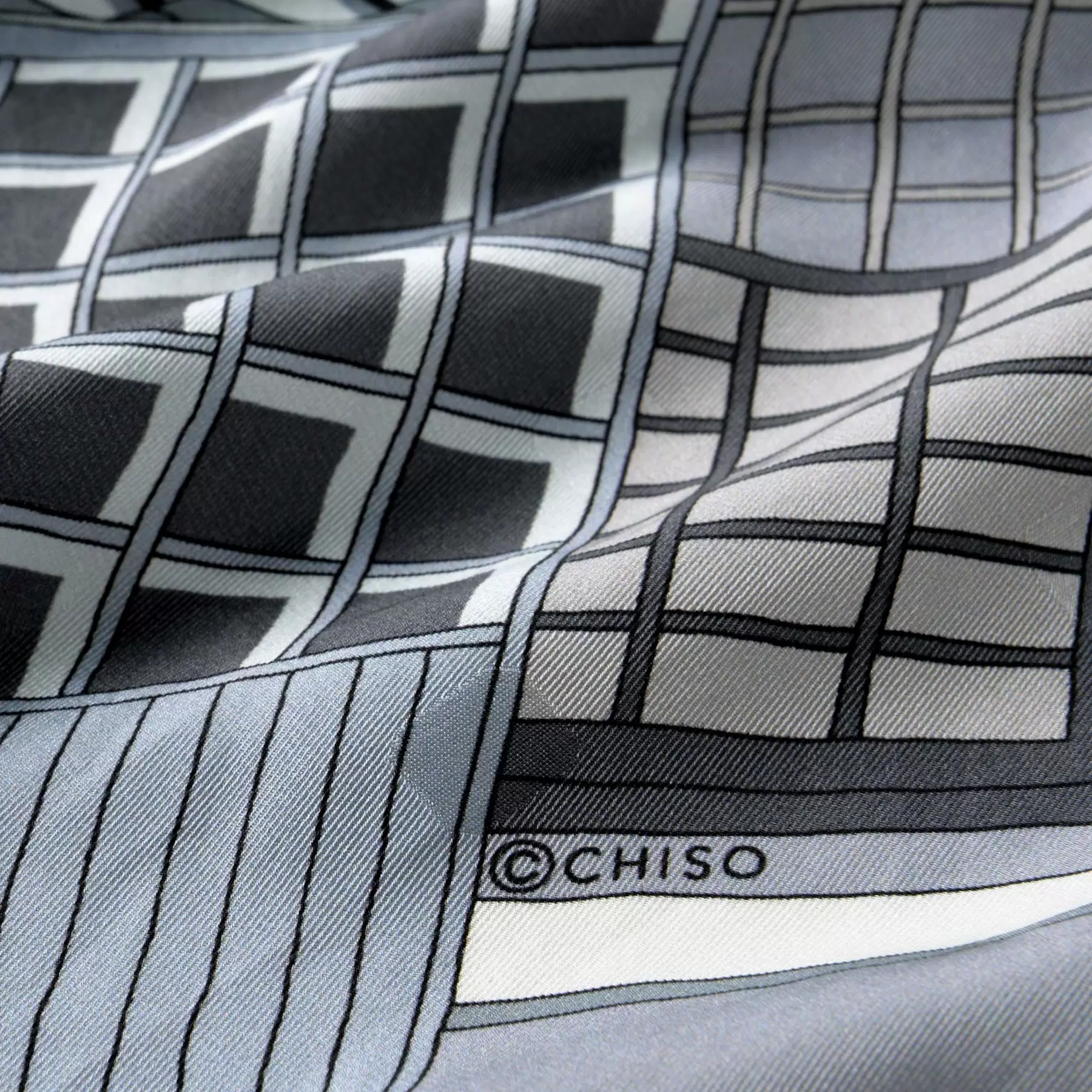 自然との調和を大事にしながら設計された京町家をデザインしたこちらのスカーフは、幾何学的な造りの中に覗く自然の柔らかな光や色彩を想像させてくれる一枚になっています。ワントーンに近いカラーリングはスタイリッシュで上品な印象を与えてくれます。