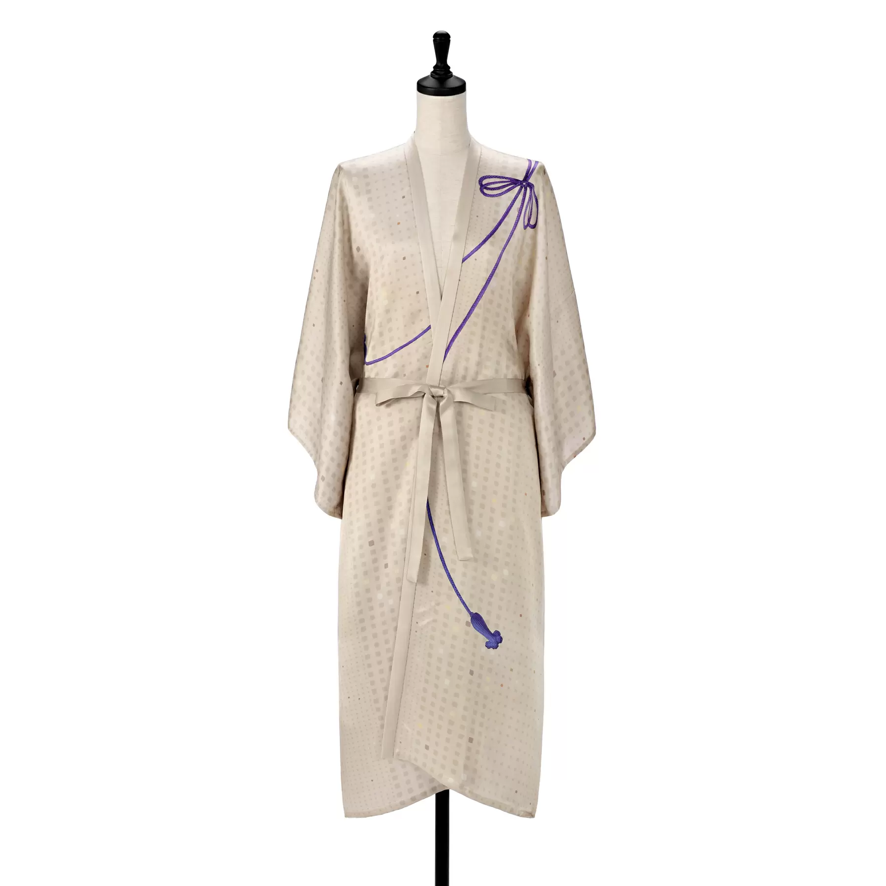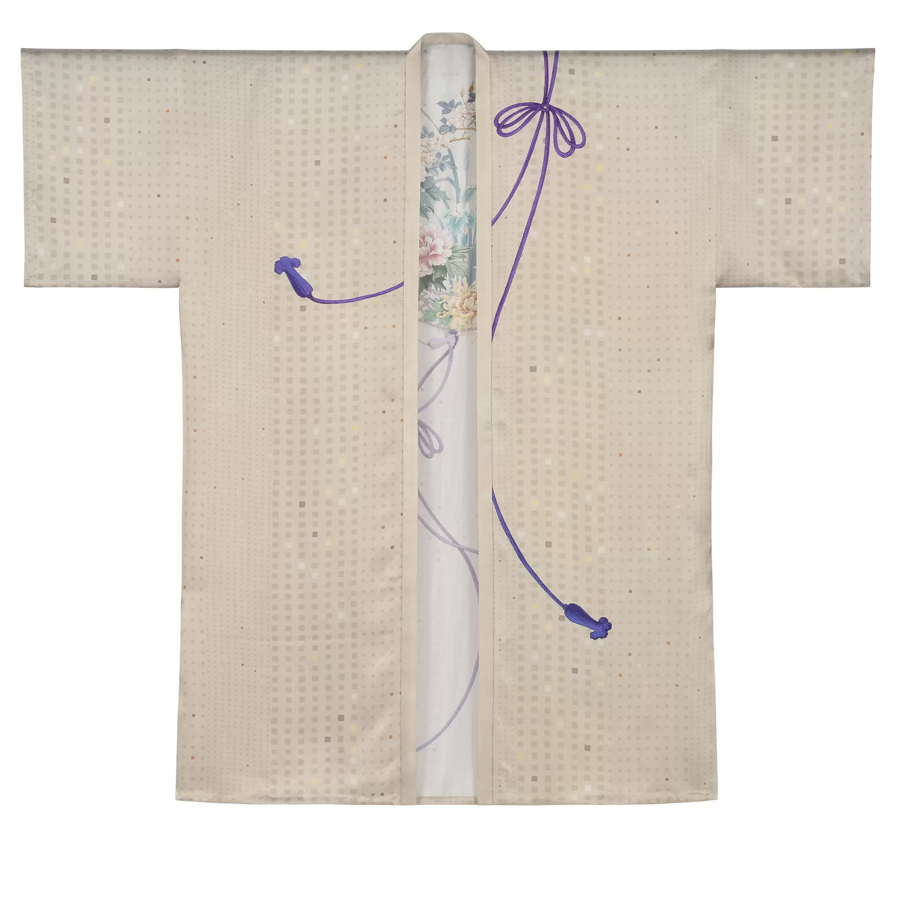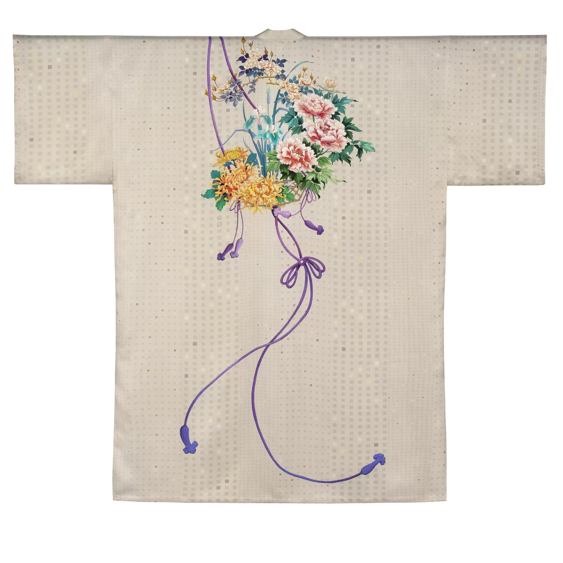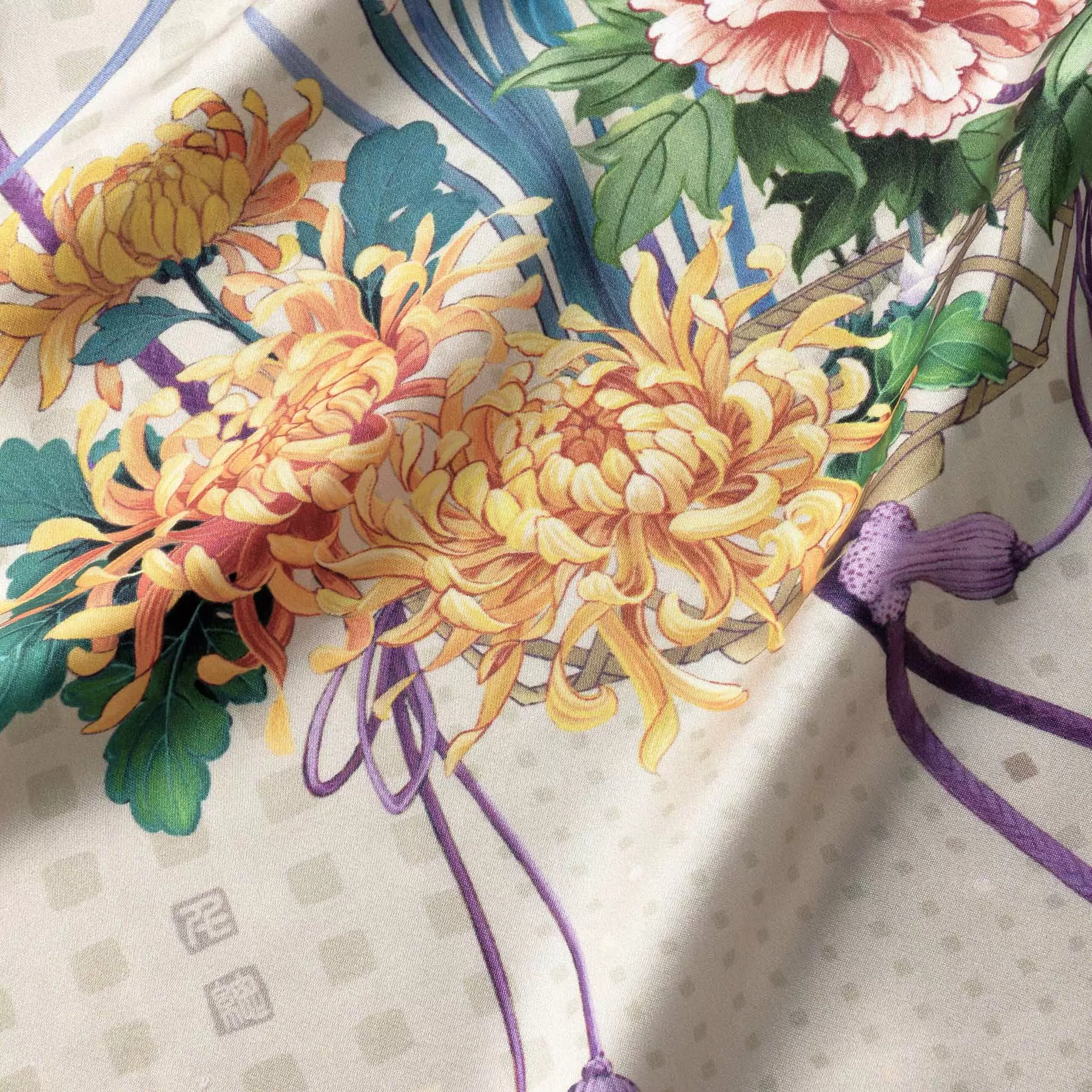 写実的に細やかに描いた牡丹や菖蒲、菊と、規則的に並んだドットのコントラストが、しっとりとした風情の中にモダンな趣きを添えています。