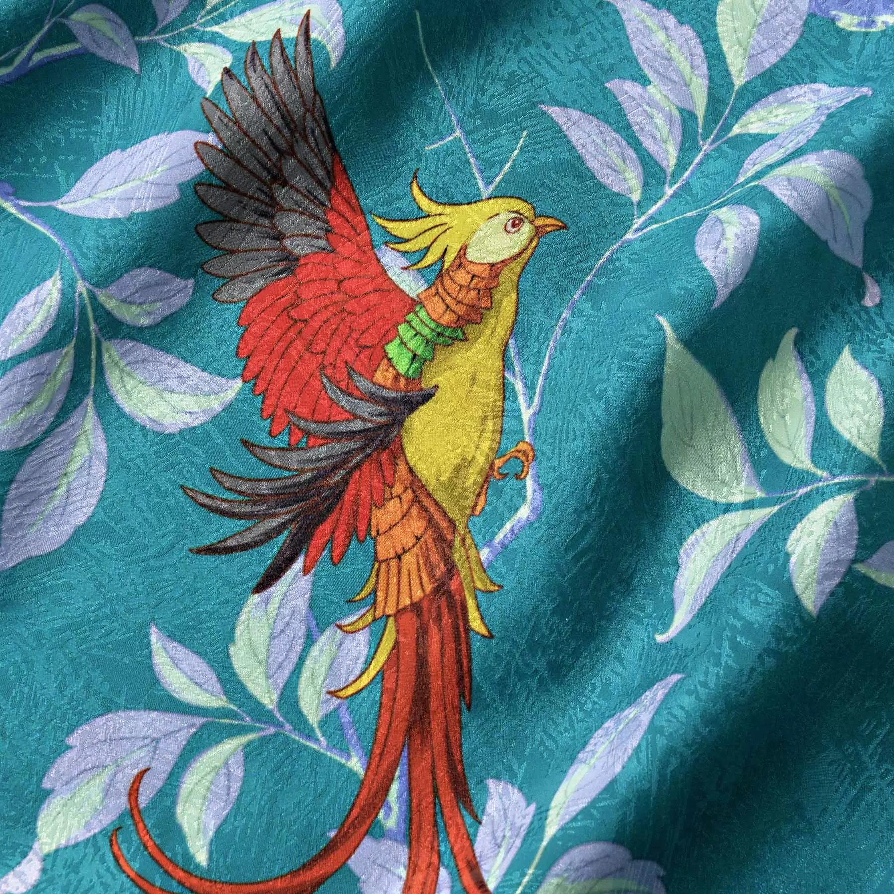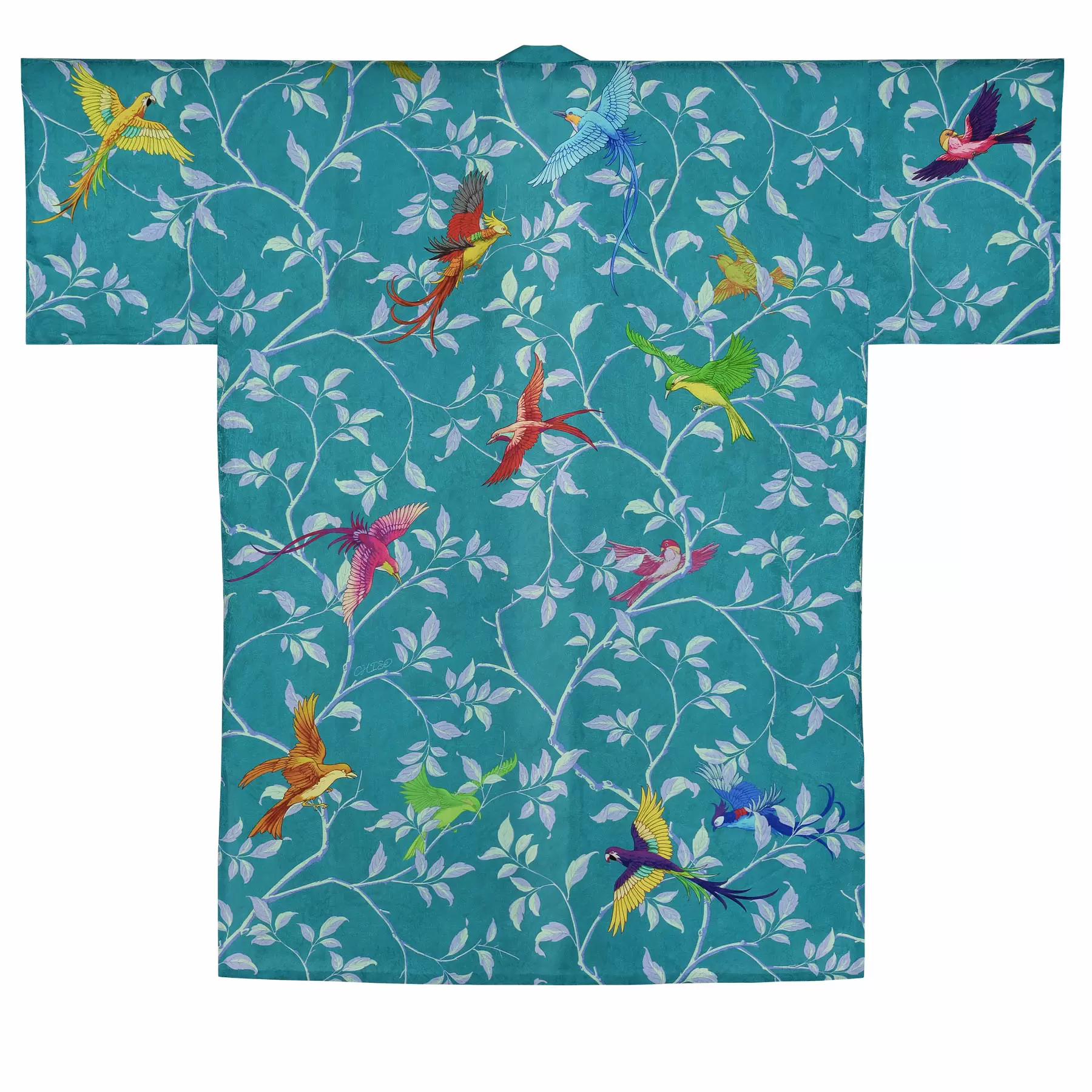 主役は着物の古典柄などでも描かれてきた鳳凰やオウムなどを組み合わせた空想の鳥たち。