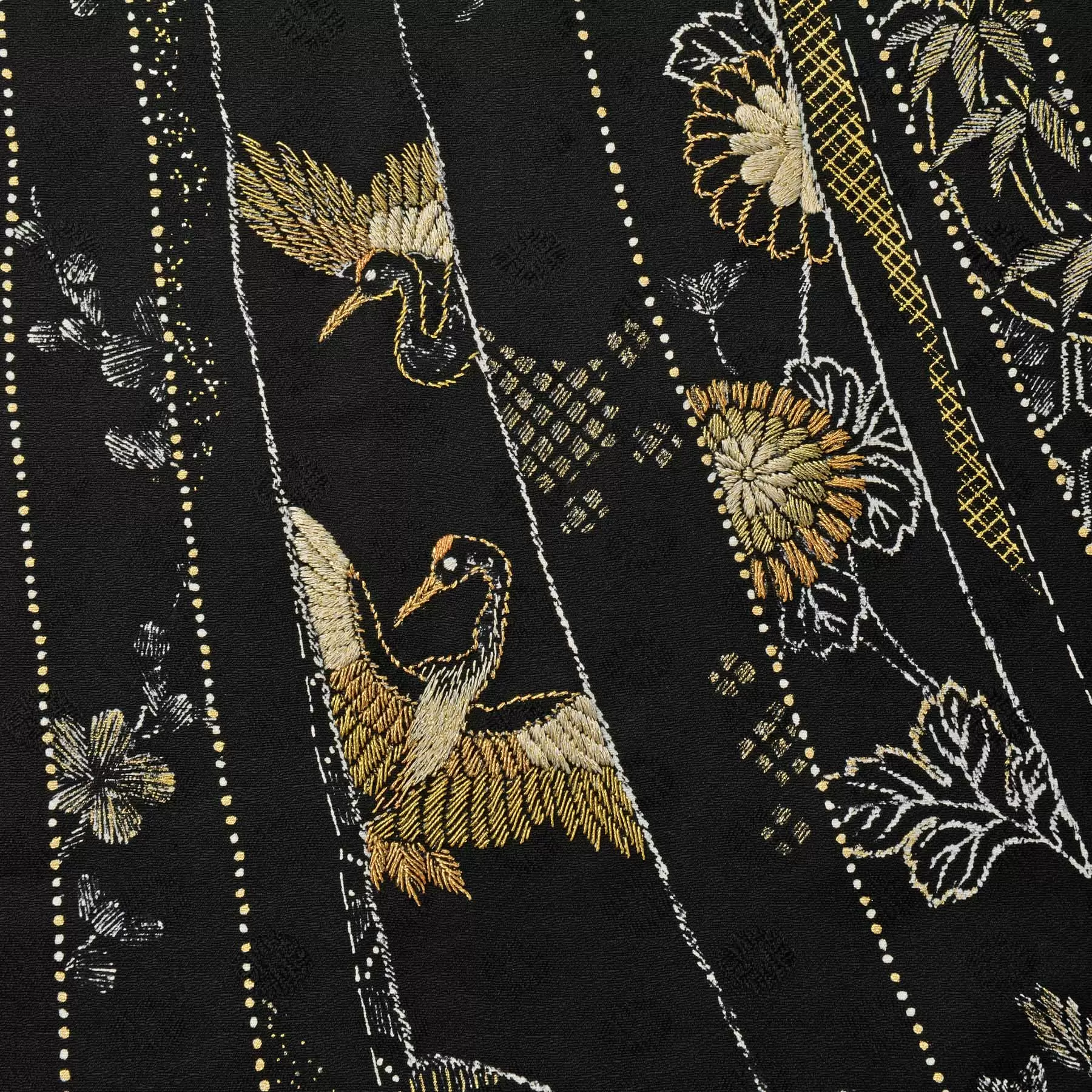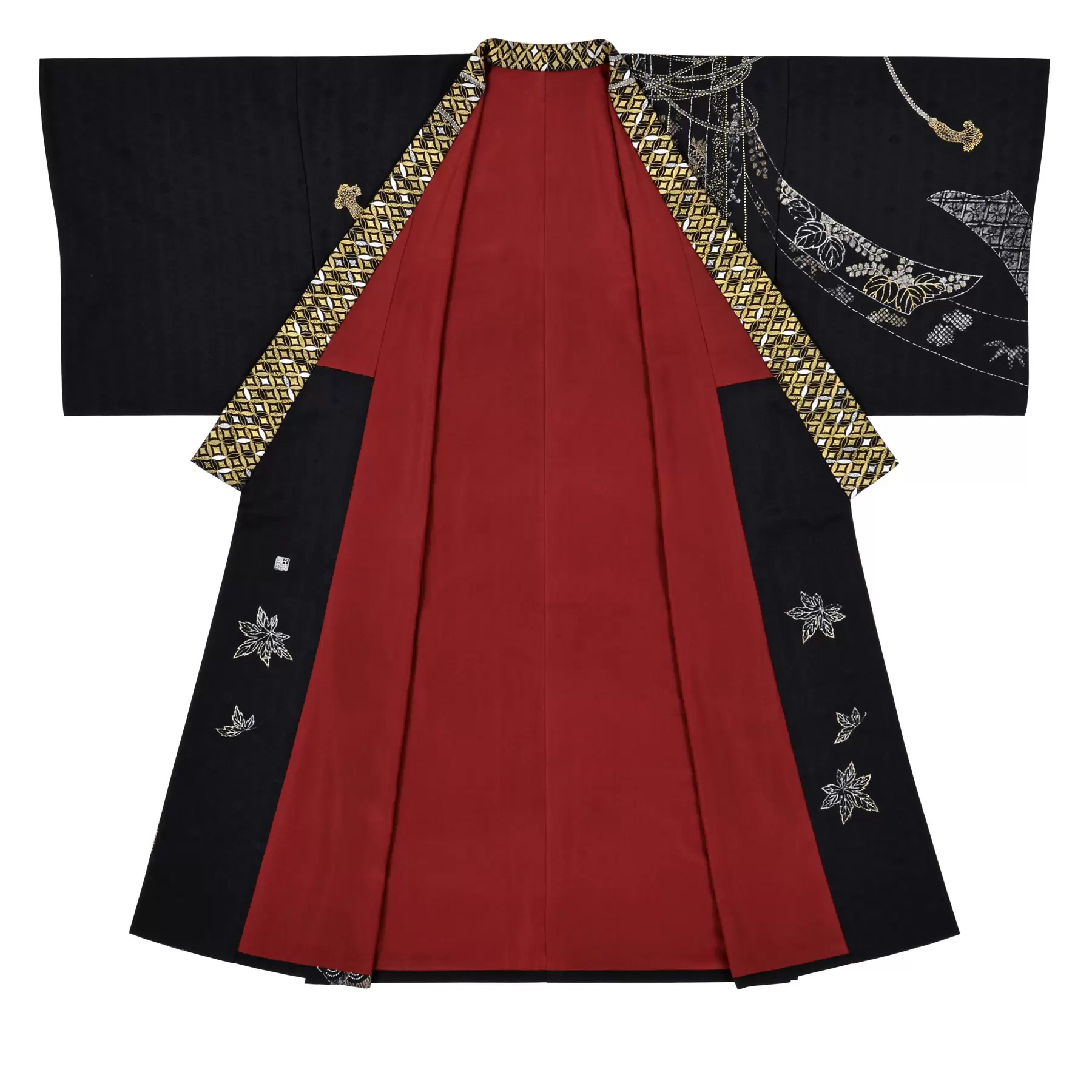 静かな夜。雲間にたゆたう月の光に照らされ、浮かんでは霞む幻想的な世界を表現しました。熨斗の中に鶴や梅、桐、菊が配され、周りをはらはらと舞うのは楓の葉。立体的な刺繍や糸目友禅のかすれ感が、奥行きのある陰影を描き出します。裏地にのぞく艶やかなエンジ色に、大人の気品が漂います。