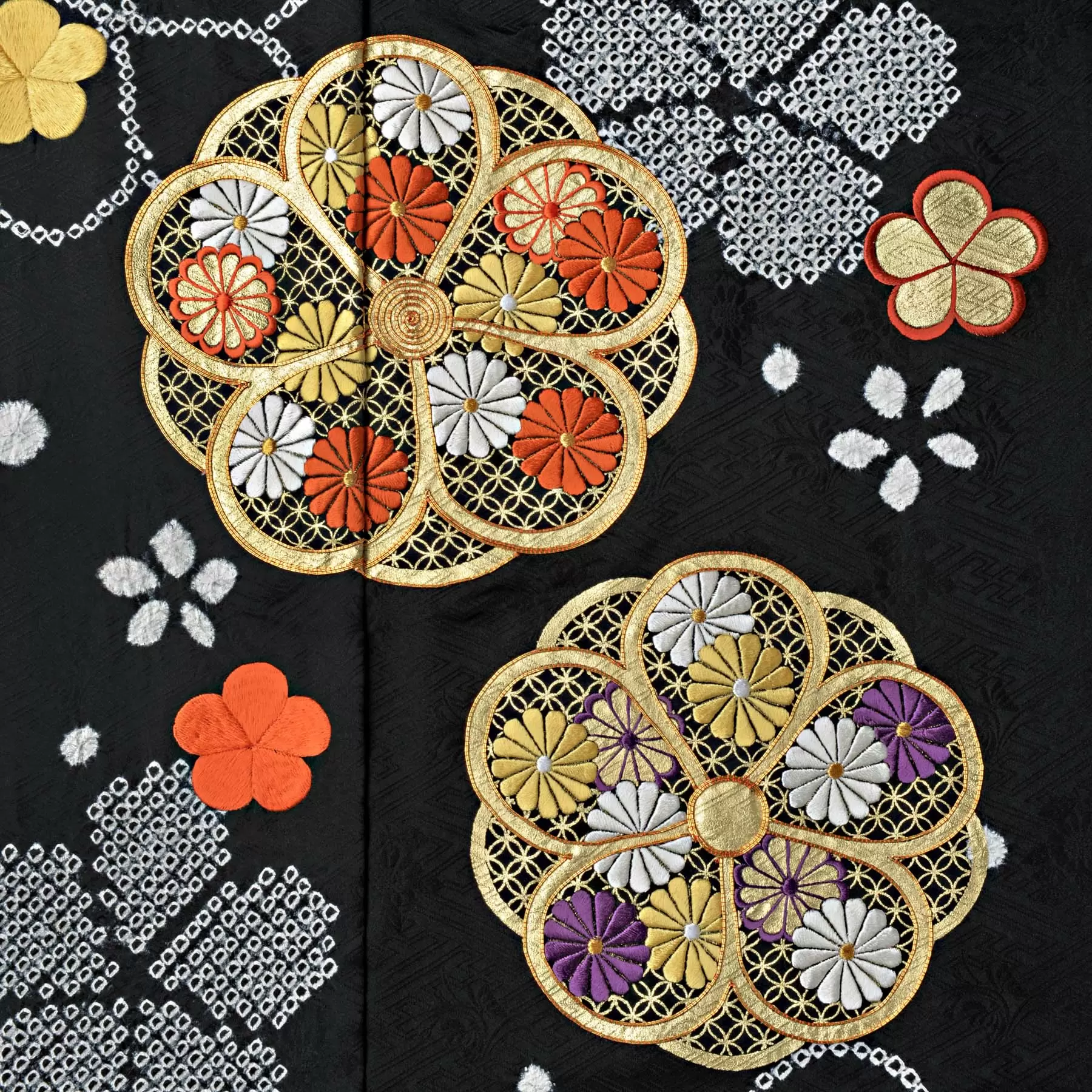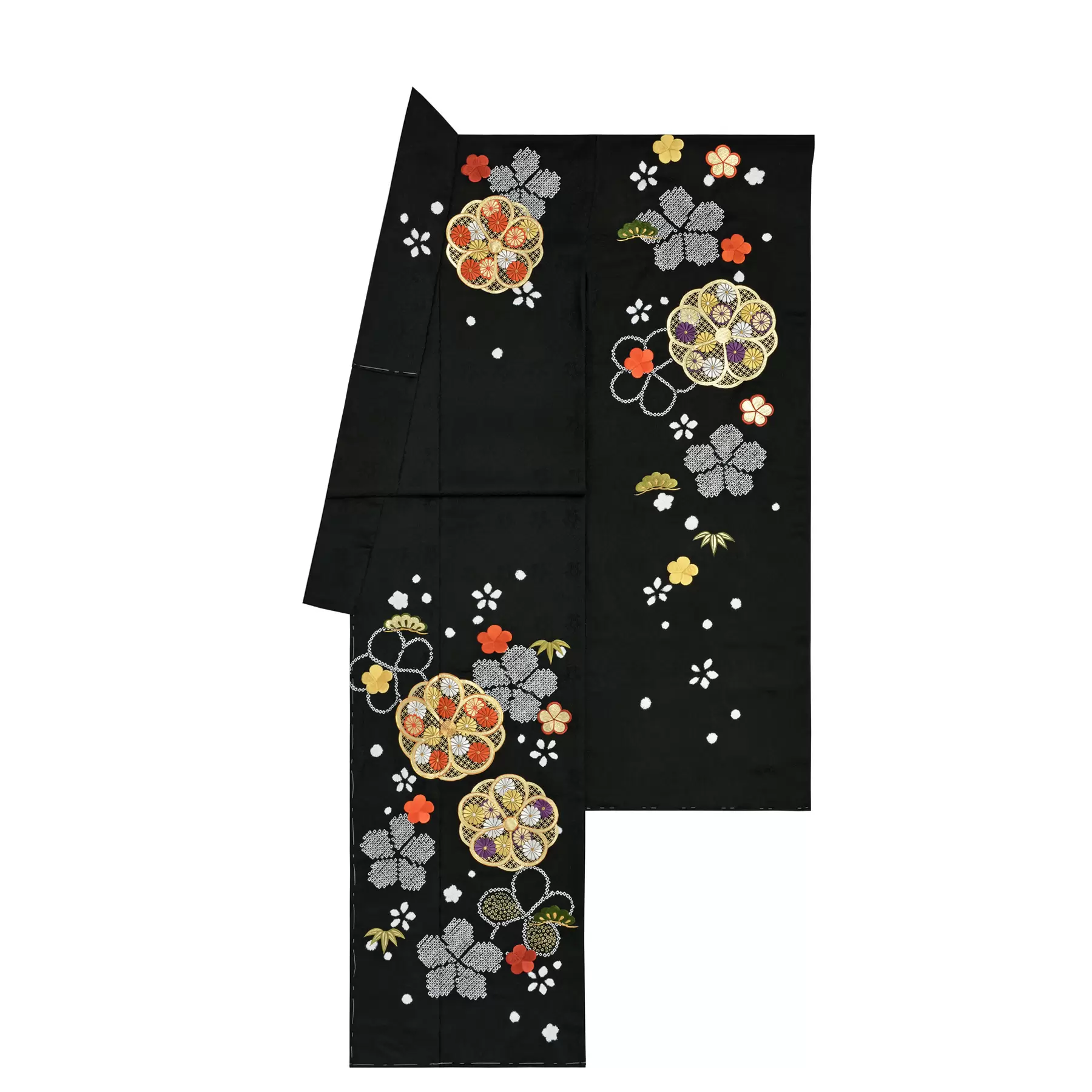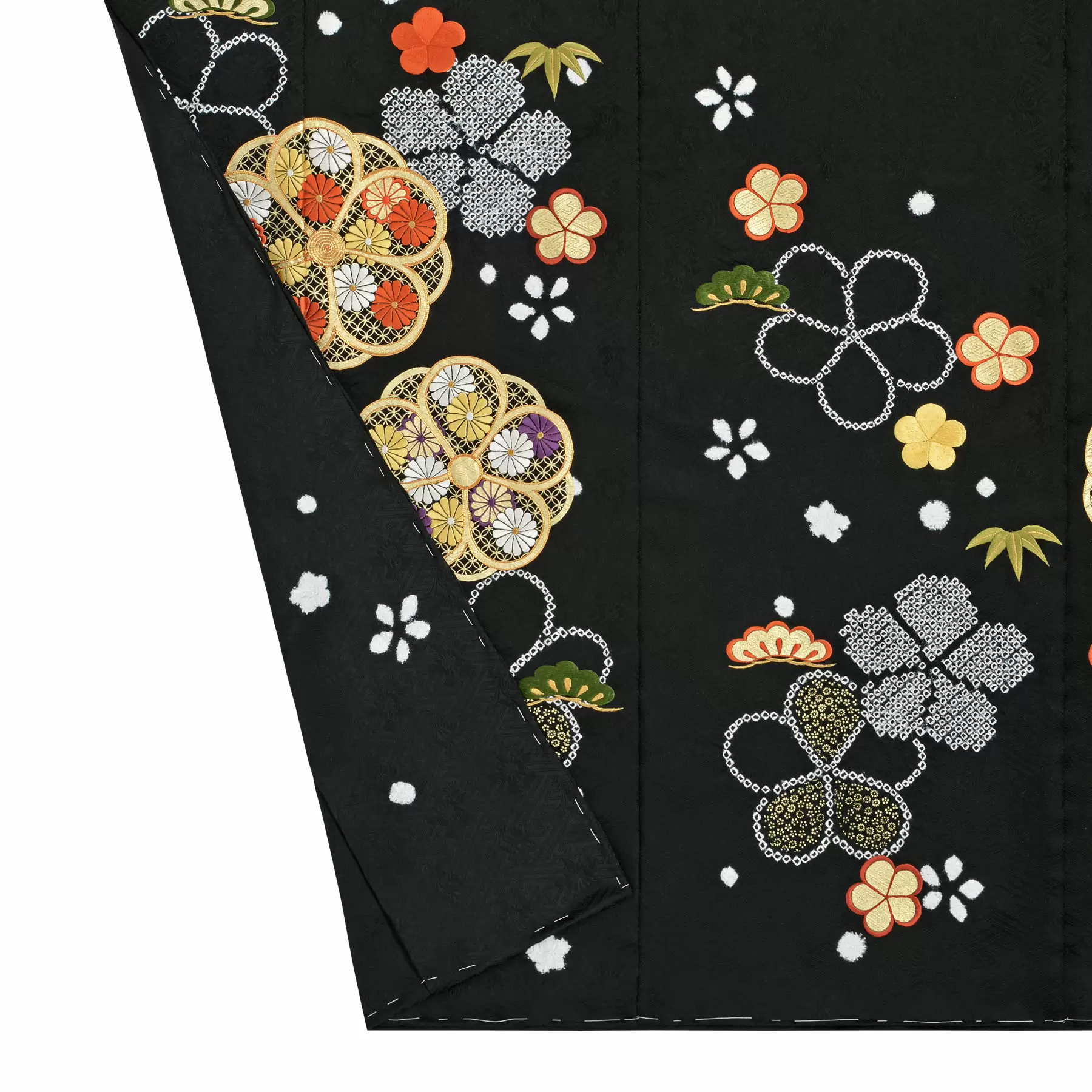 深い黒の地色に、松竹梅の意匠がくっきりと映え、ころころと浮かぶ愛らしい振袖です。金彩と刺繍をふんだんに施すことによって豪華さを演出しながらも、疋田絞りや帽子絞りによって白く浮かび上がる梅が全体をすっきりと見せます。古典的な意匠を今に受け継ぐ鮮やかな振袖です。