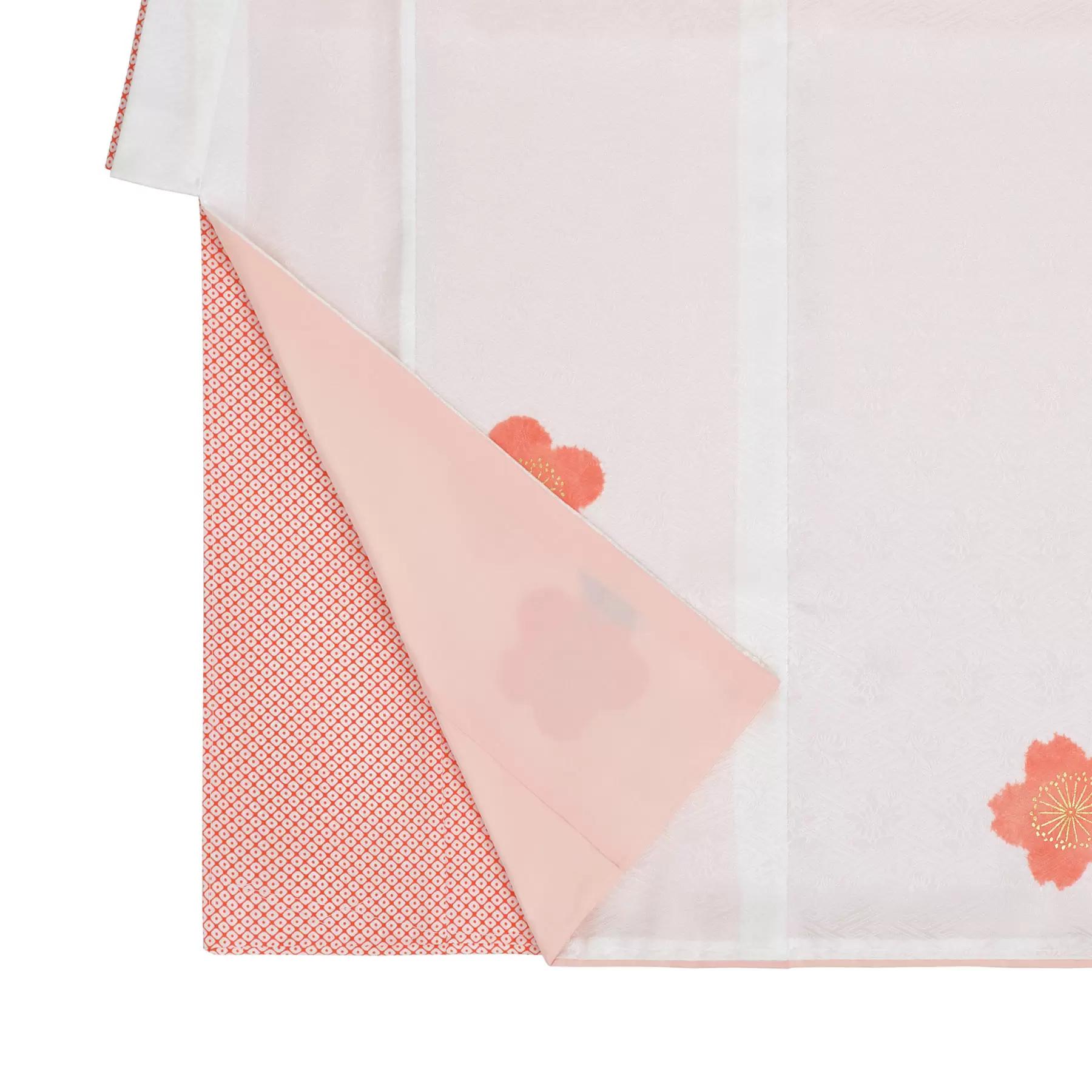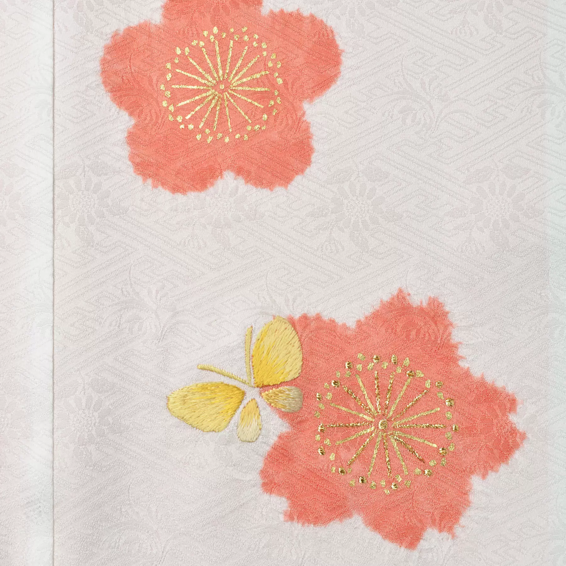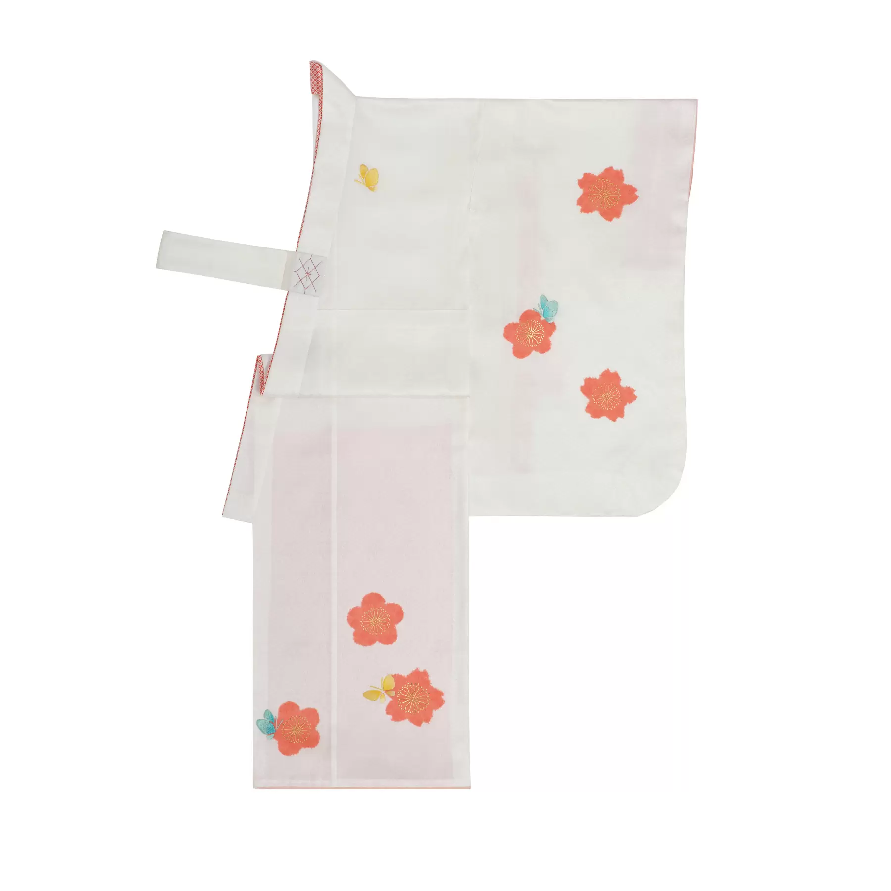 桜と梅の香りに誘われるかのように、蝶が軽やかに舞う意匠です。成長に合わせ姿を変える蝶は、健やかな成長と永遠性を象徴するおめでたい柄。絞り染と金彩、刺繍でやわらかく表現した、すっきりとした構成の中に気品と愛らしさが漂います。さまざまな被布とのコーディネートをお楽しみいただけます。