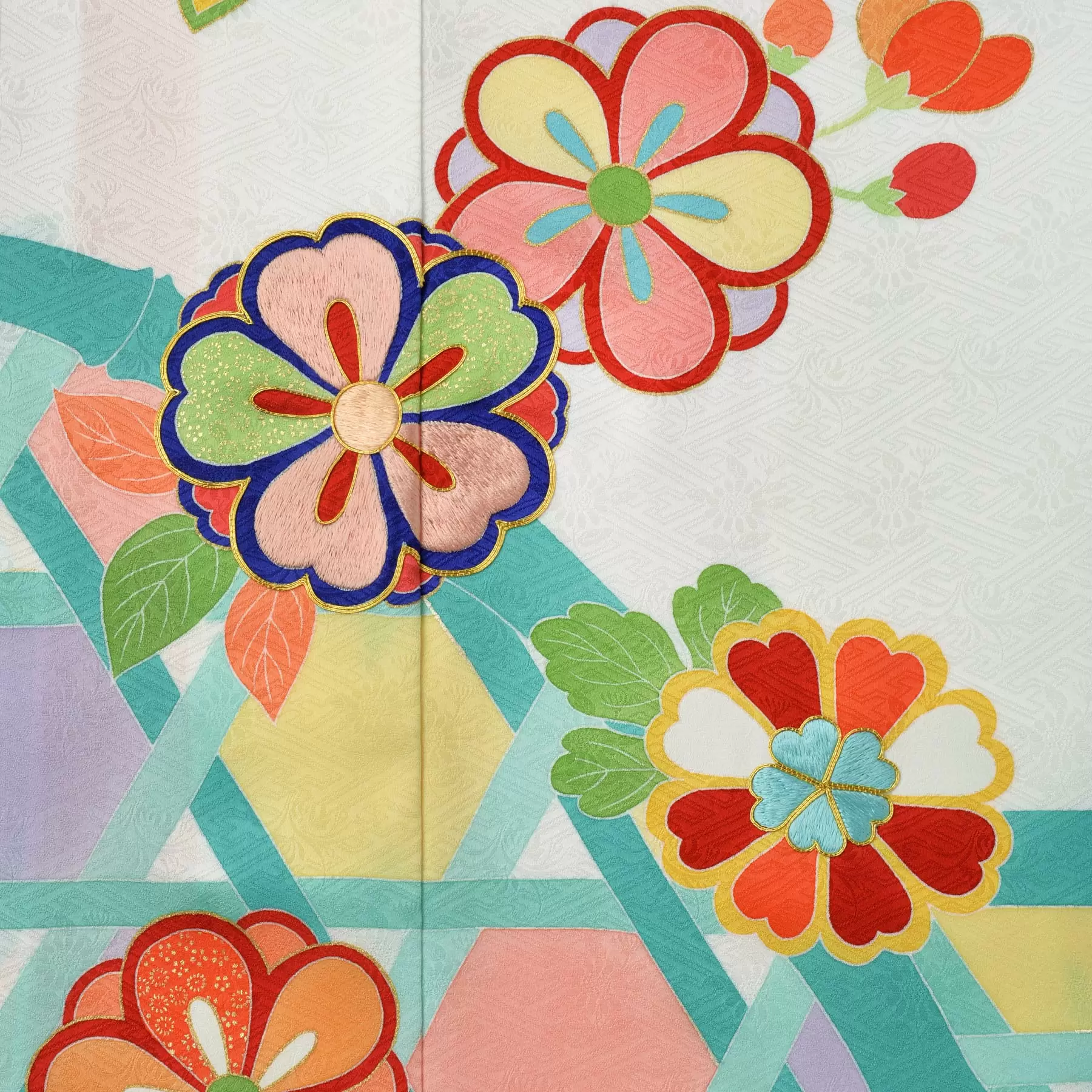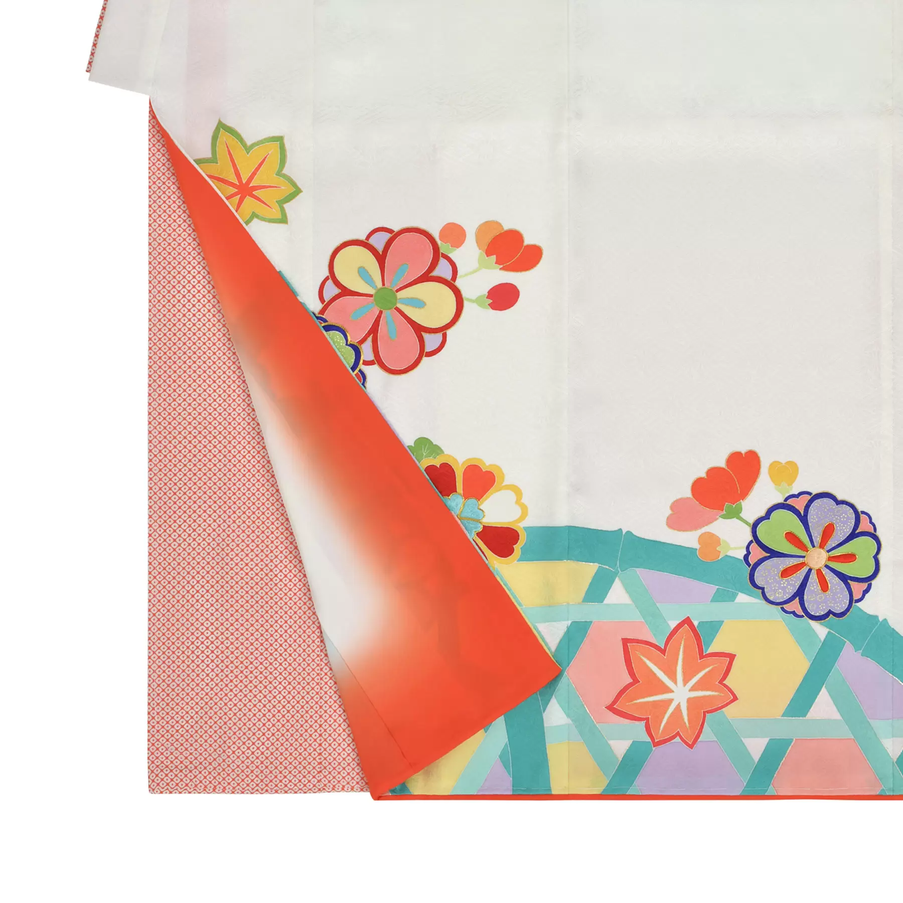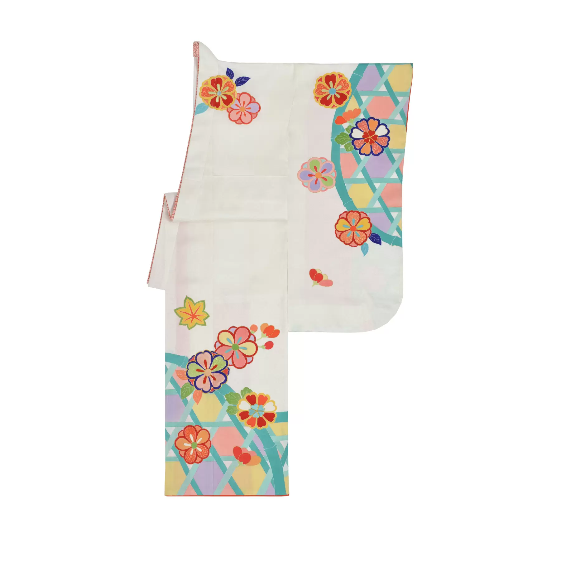 清らかさや新たな始まりを表す白地に、愛らしい丸い花々が映える祝着です。籠目は、魔除けや家運安泰を意味する文様。袖や裾にステンドグラスのようにあしらい、華やかで遊び心溢れる世界を表現しました。古典をベースにしながらお子様に愛されるテイストに仕上げた一枚です。