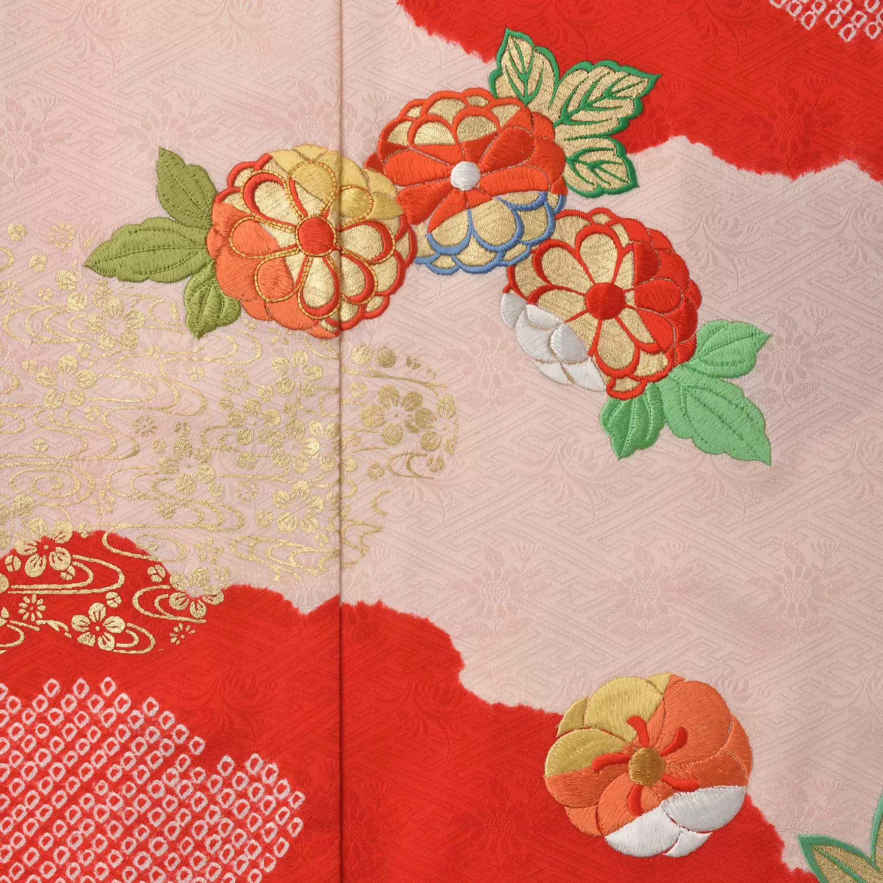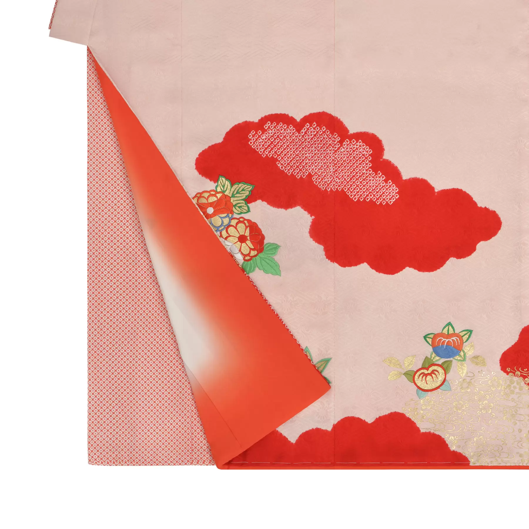 透明感のあるピンク地に、深みのある赤を重ねた上品な色合わせは、少女の可憐さを引き立てるとともに、大人への一歩を祝う節目にふさわしい気品を漂わせます。