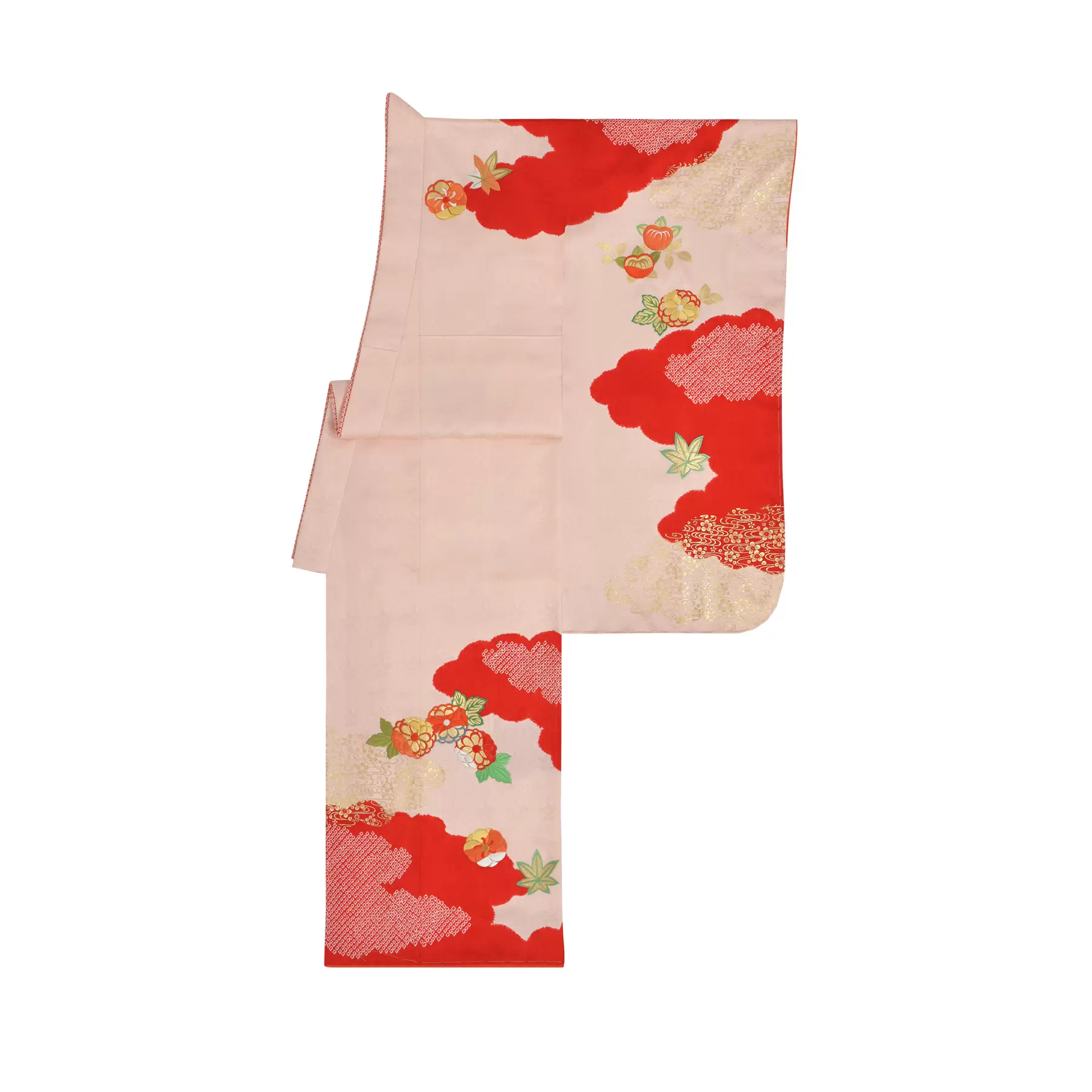 大空に悠々とたなびく雲と、色とりどりの花々を合わせました。鮮やかな色彩のコントラストが、晴れの日にふさわしい華やぎをもたらします。雲は運気や幸運の兆しを象徴する吉祥文様。お嬢様の健やかな成長と豊かな人生への願いが込められています。