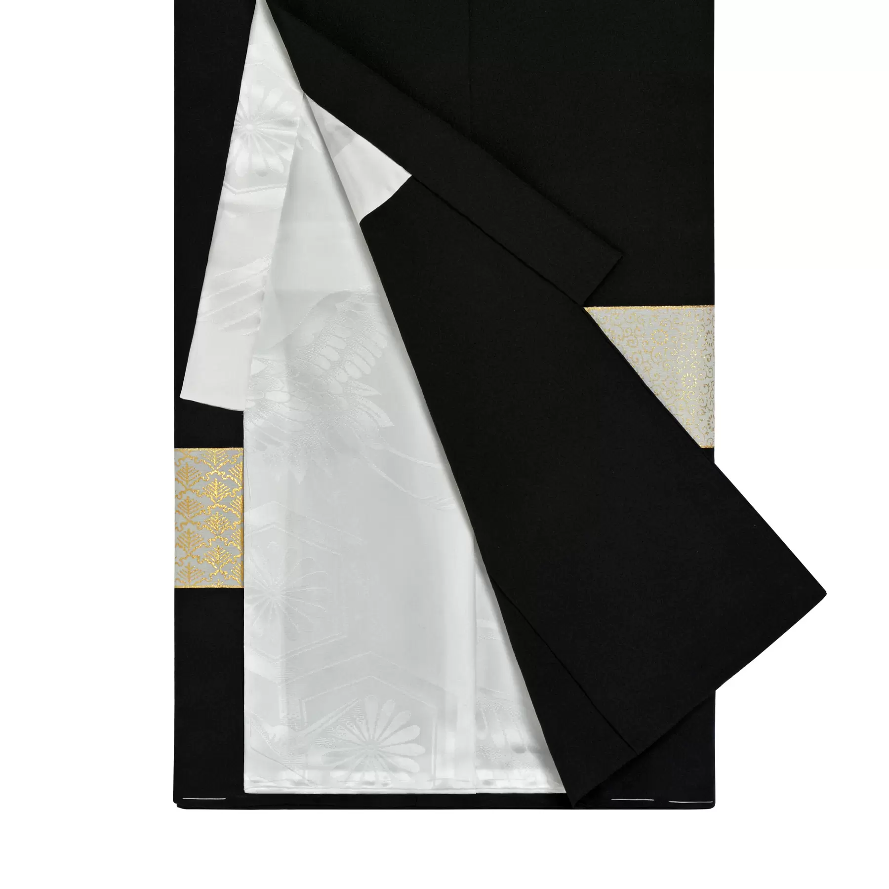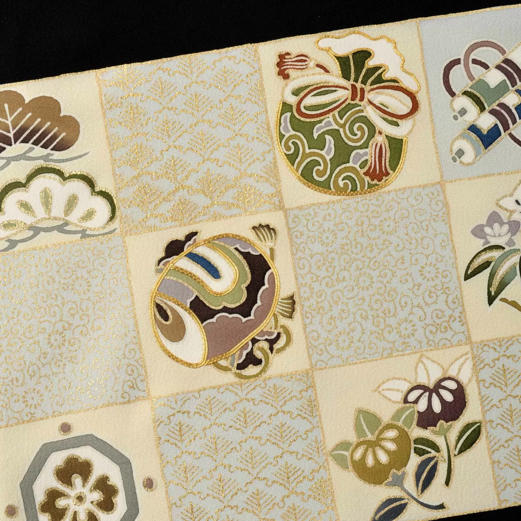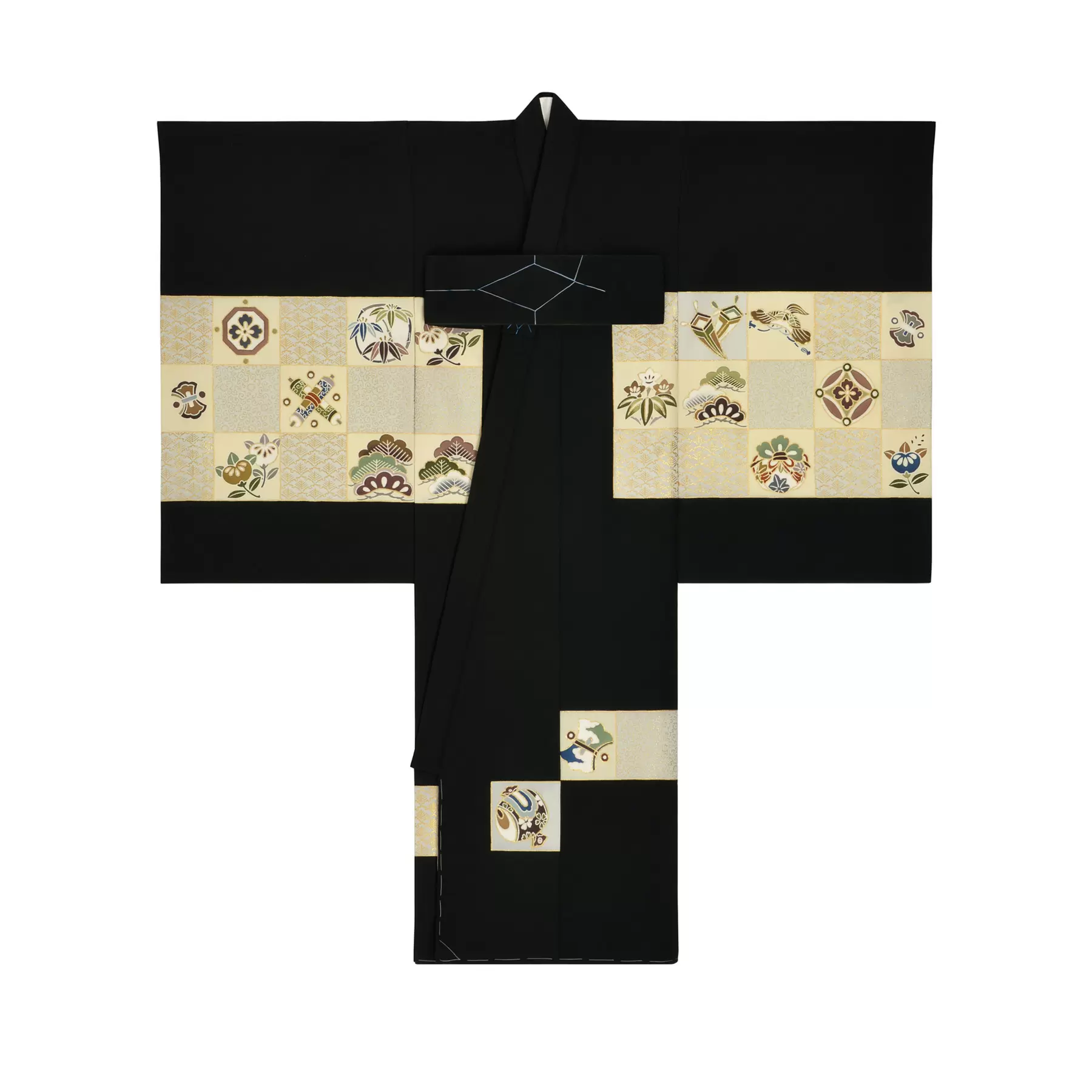大きな横段の柄が配置される熨斗目は、武家の衣裳に由来する格調ある意匠です。市松模様の中に、お祝いの日にふさわしい宝尽くしと橘をあしらいました。端正で正統感のある佇まいは、伝統的な趣を大切にされるご家族にもふさわしい一枚です。