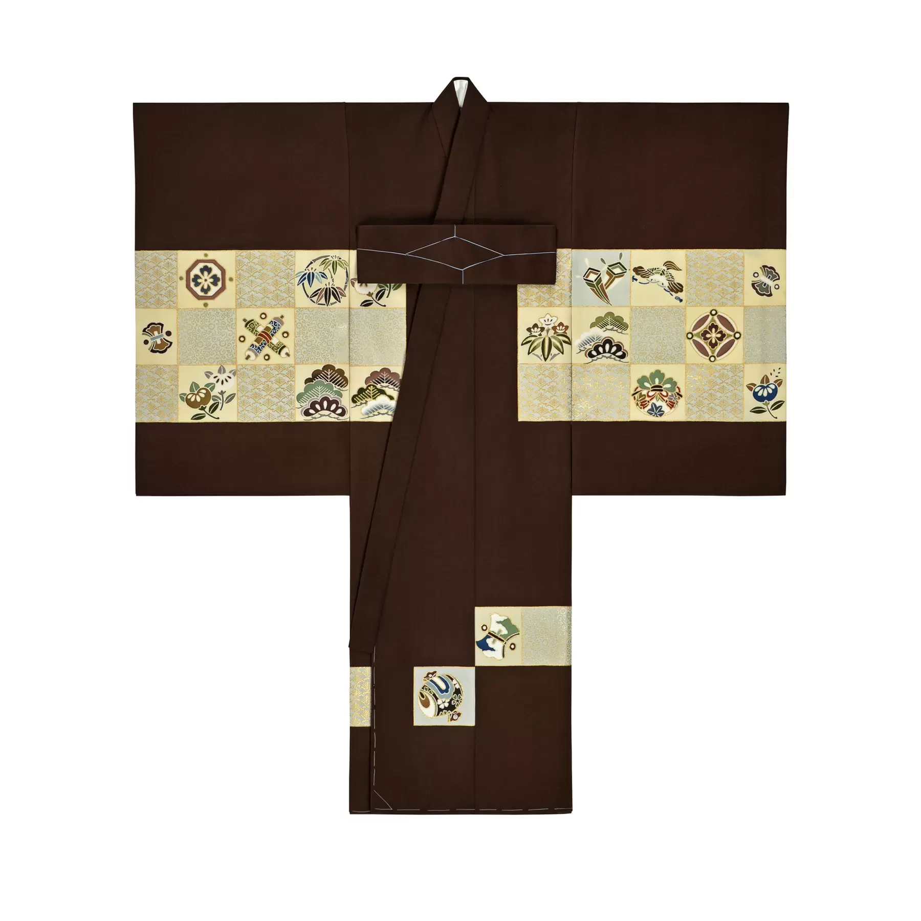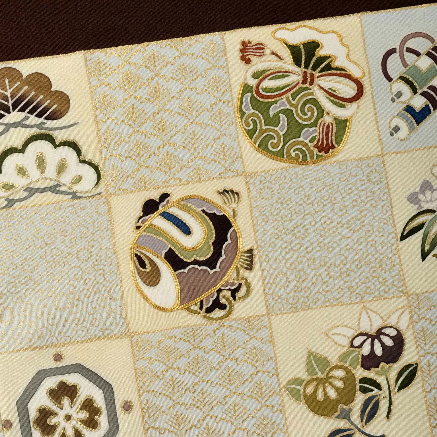 大きな横段の柄が配置される熨斗目は、武家の衣裳に由来する格調ある意匠です。市松模様の中に、お祝いの日にふさわしい宝尽くしと橘をあしらいました。端正で正統感のある佇まいは、伝統的な趣を大切にされるご家族にもふさわしい一枚です。