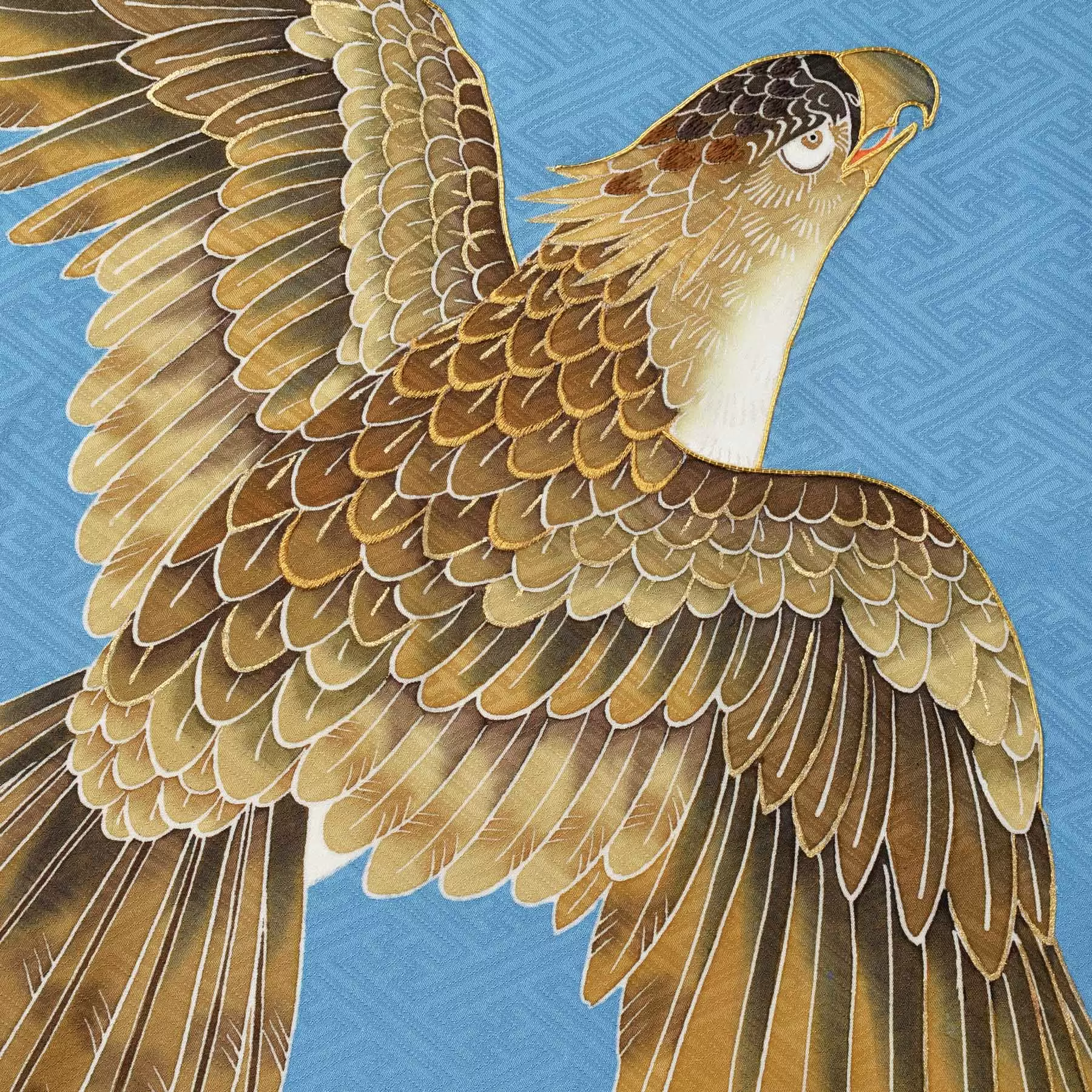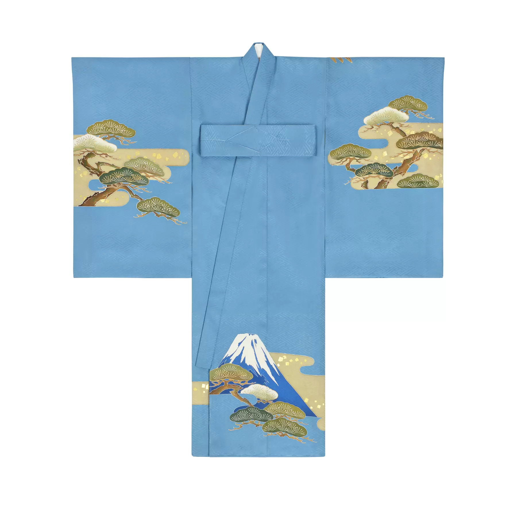 初夢に見ると縁起が良いとされる鷹に富士をモチーフにしました。男の子の意匠として人気の高い鷹は、空へと力強く飛び立つ姿を写実的に描きました。舞い落ちる羽を茄子に見立てる遊び心を忍ばせたもの。未来へ向かって大きく羽ばたいてほしいという願いを託した祝着です。