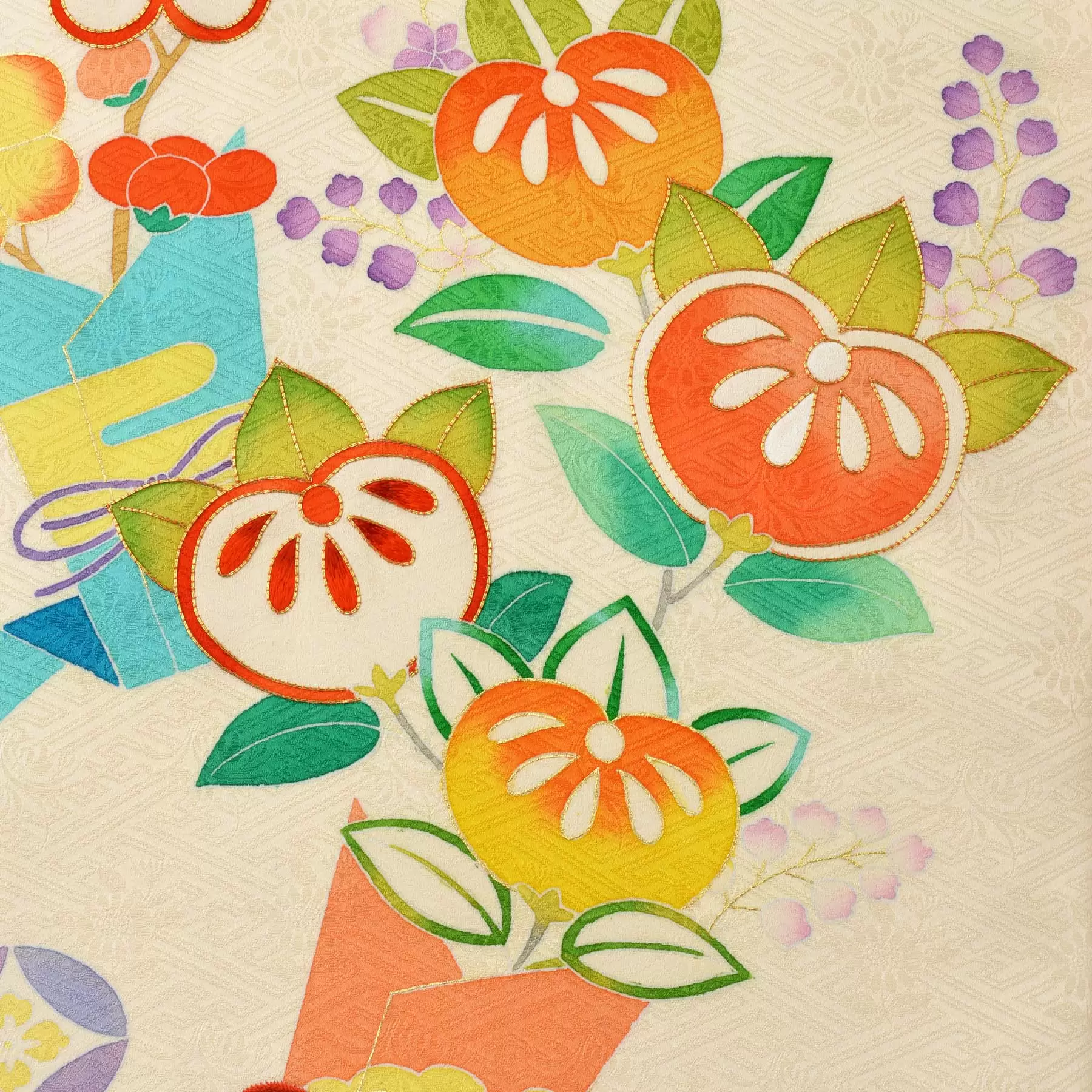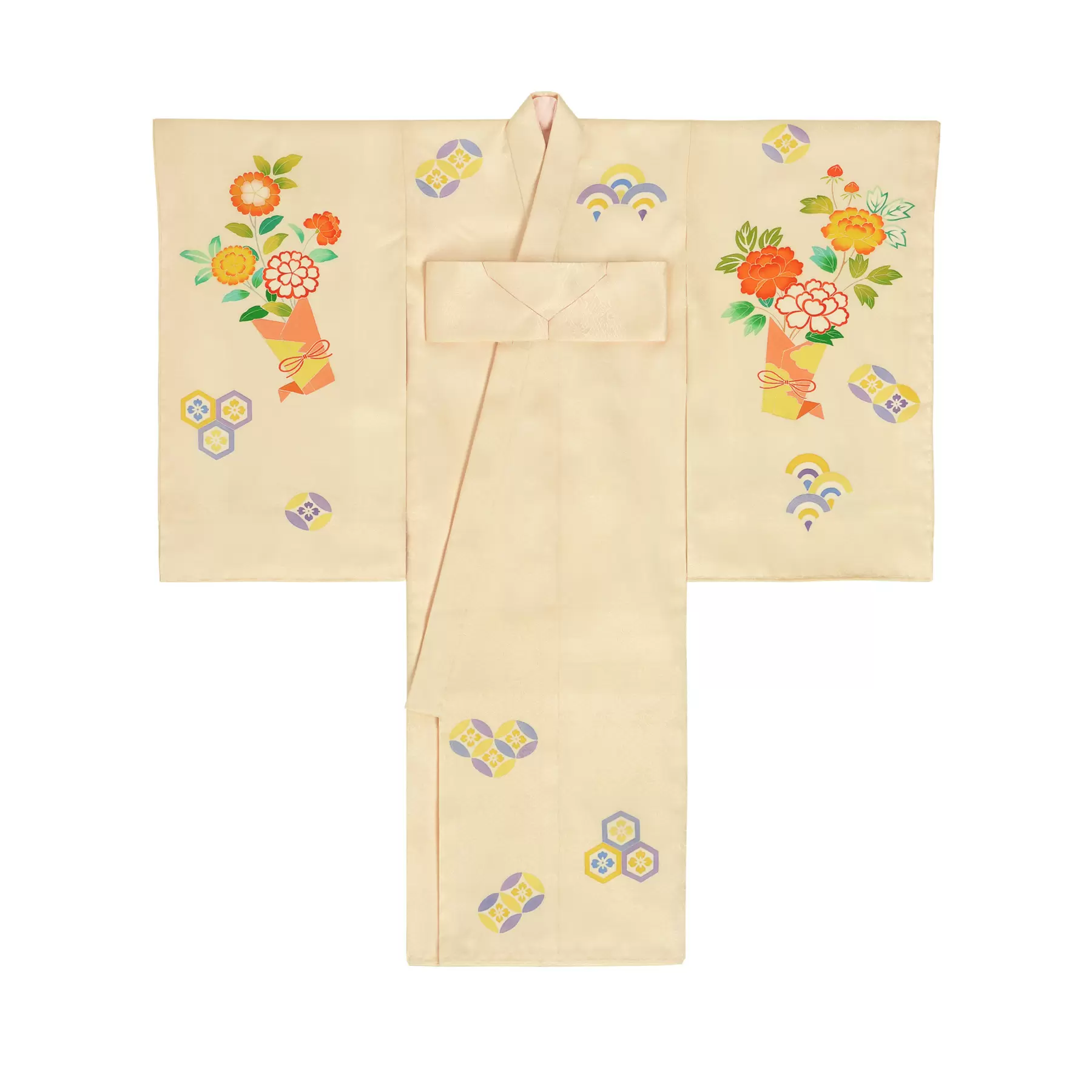 桜、橘、菊、椿、梅―四季折々の花々を束ね、紙で包み水引で飾った花熨斗をモチーフとしています。伝統的な京友禅の技法で、華やかな色彩で染め上げています。お子様の御誕生とこれから歩む人生に花を添える、彩り豊かな初着です。