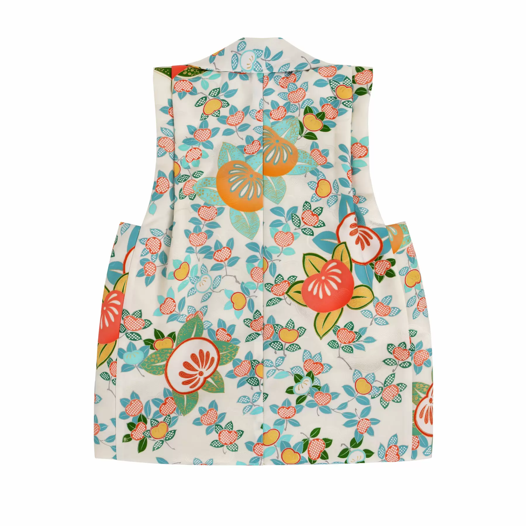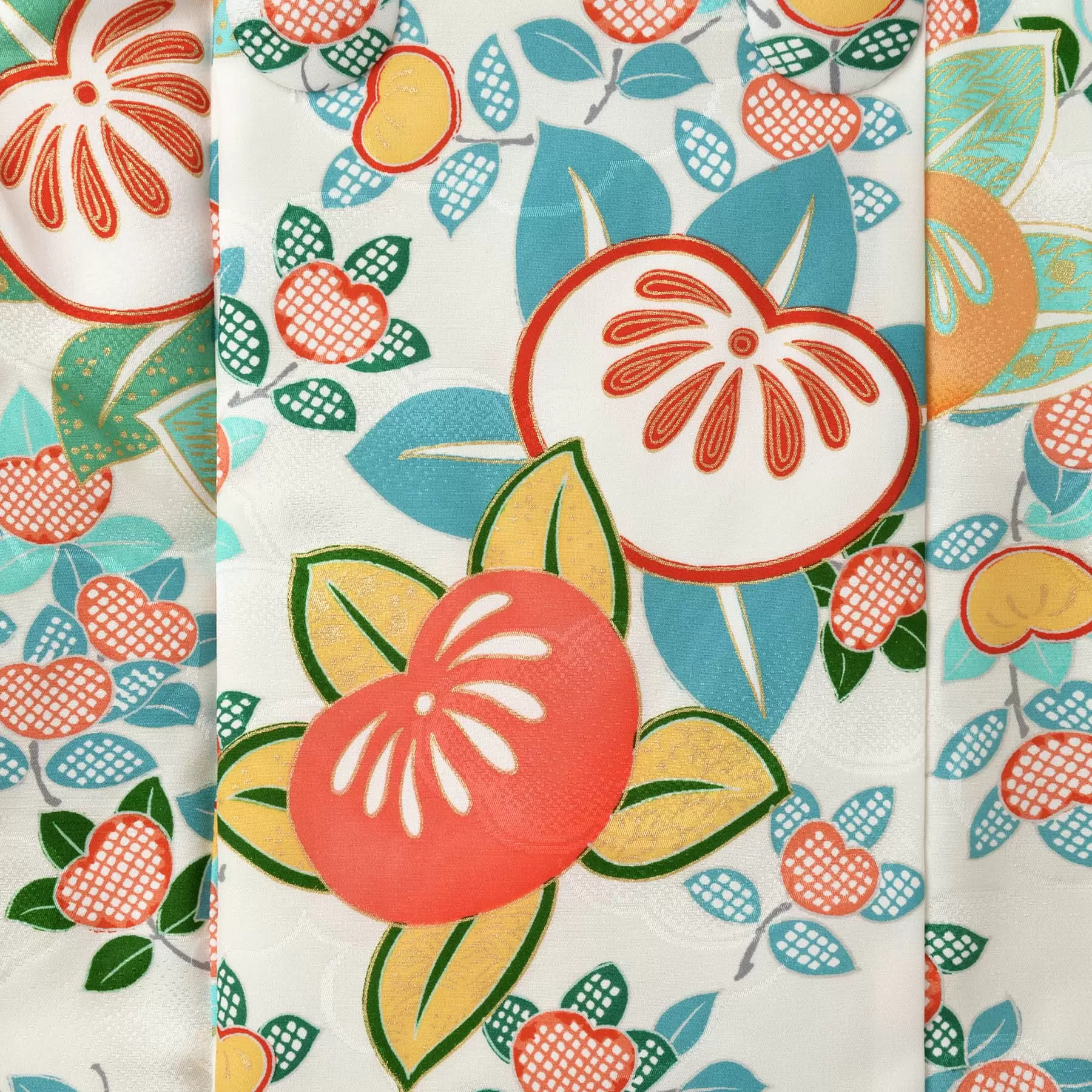 千總の社紋に描かれる橘は、日本で生まれた吉祥文様で、長寿の象徴とされています。運気や幸運の兆しを表すおめでたい雲取の地紋に、たくさんの可愛い橘が描かれた、お祝いの気持ちが溢れる一枚です。衿元にはクルミボタンをあしらい、すっきりと整えました。
